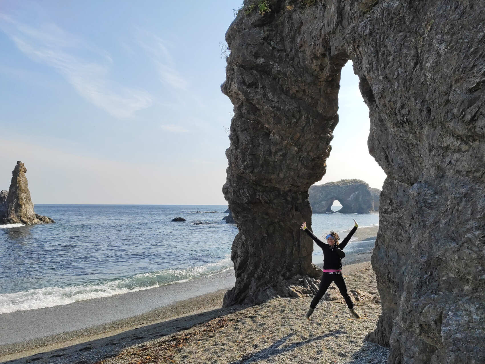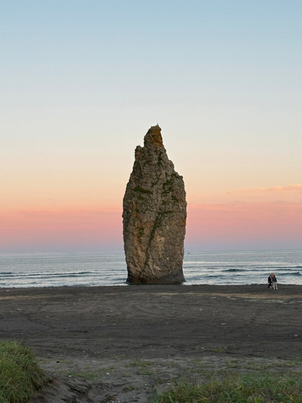 Чуть позже вы дойдёте до дикого пляжа, которому, кажется, не свойственны полумеры — песок здесь либо кварцевый белый, либо титано-магнитовый чёрный. А на фоне — величественные вулканы Сахалина и кристально чистые воды Тихого океана. Глядя на такое, невозможно остаться равнодушным.