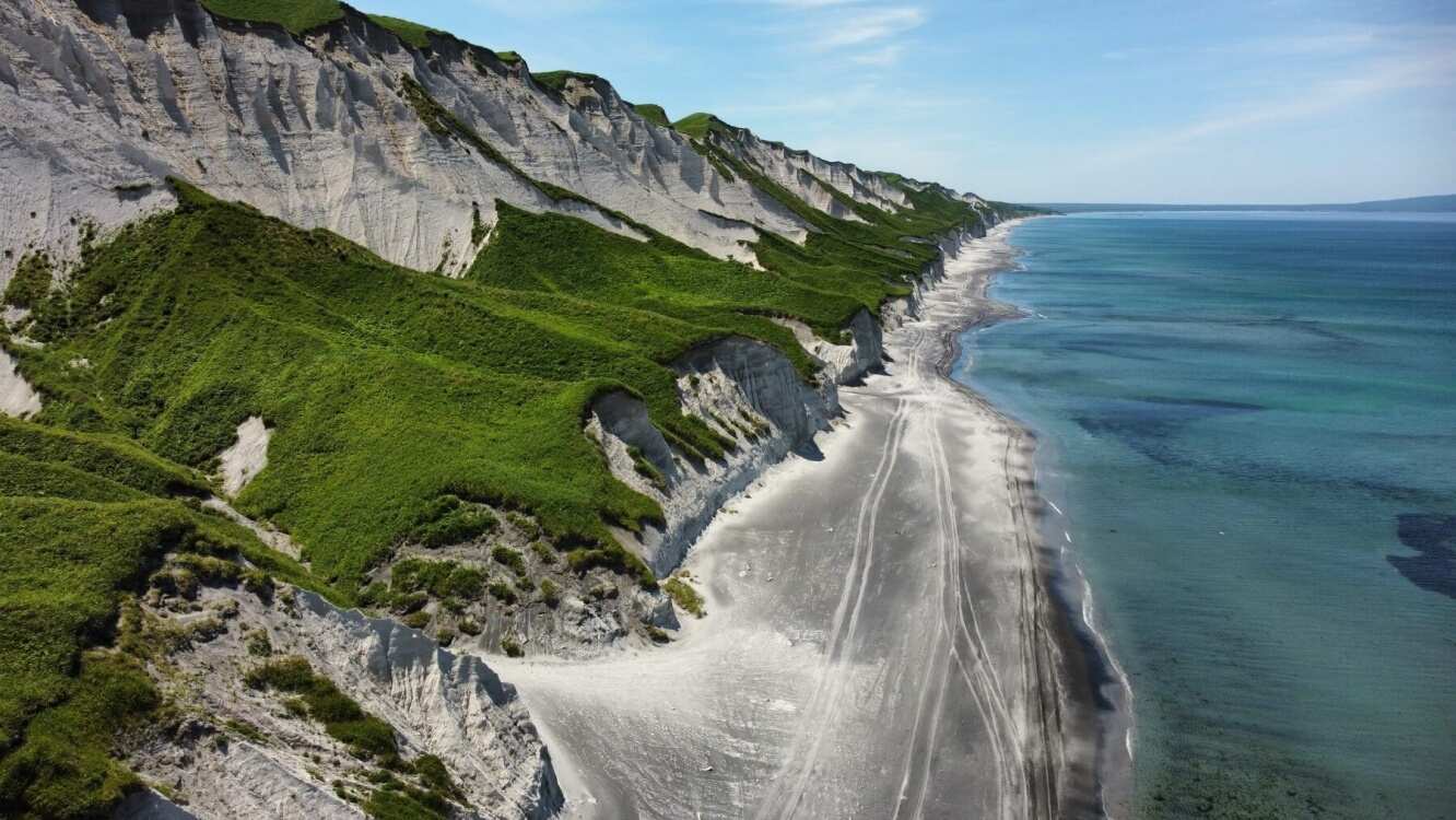 Сегодня вы отправляетесь знакомиться с Курильскими островами. И первый из них — Итуруп. Улетите на остров на самолёте и в тот же день успеете увидеть первое удивительное место — плато Янкито. Берег Курильского залива здесь напоминает другую планету! Местные пляжи — самая настоящая застывшая вулканическая лава, и именно она стирает границу между реальным и космическим! Дополняют их окружающие пляж тёмные скалы, через твёрдую лавовую прослойку которых кое-где пробивается сочная зелёная трава.