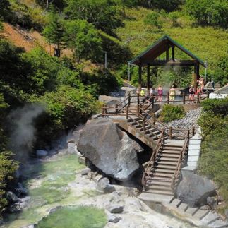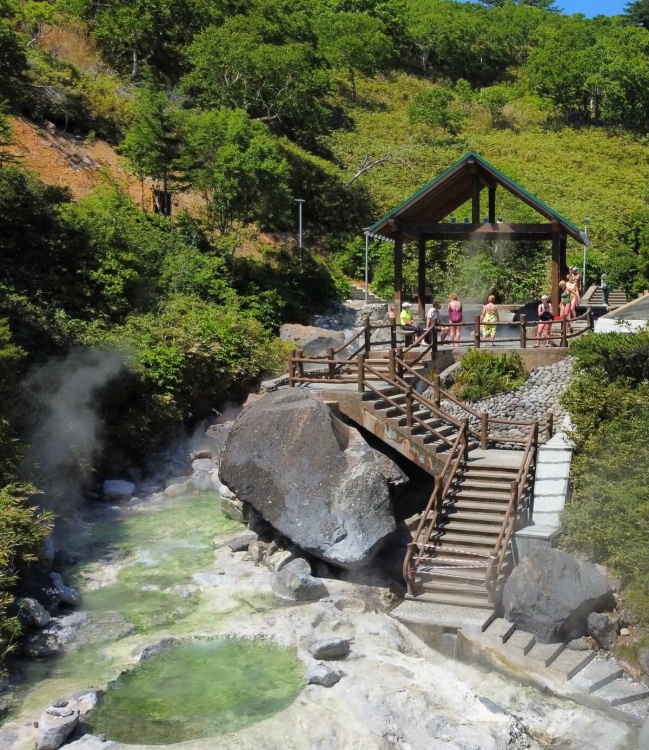 А ещё вы увидите геотермальную станцию и озера Голубые глазки, откуда начинается сернокислотная река Кипящая. Здесь, кстати, будет привал — вы сможете отдохнуть в бурлящей ванне под струями водопада.