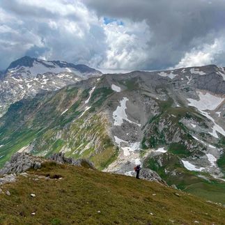 Проходим вдоль леопардового озера и скальных лбов. Часто делим малохоженую тропинку с дикими сернами. Здесь мы гости. С каждым часом приближаемся к приюту Фишт.