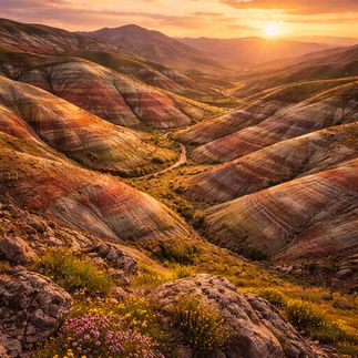 Этот день — переход в другой ритм жизни. Сначала — Хызы, где пейзажи выглядят почти нереальными: цветные холмы, линии горизонта и ощущение простора.