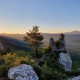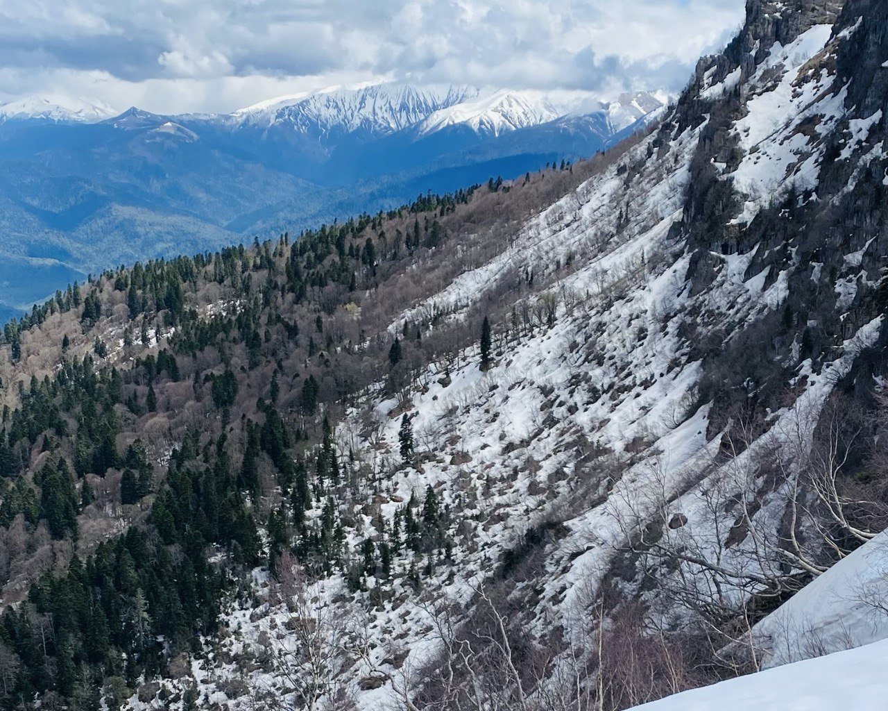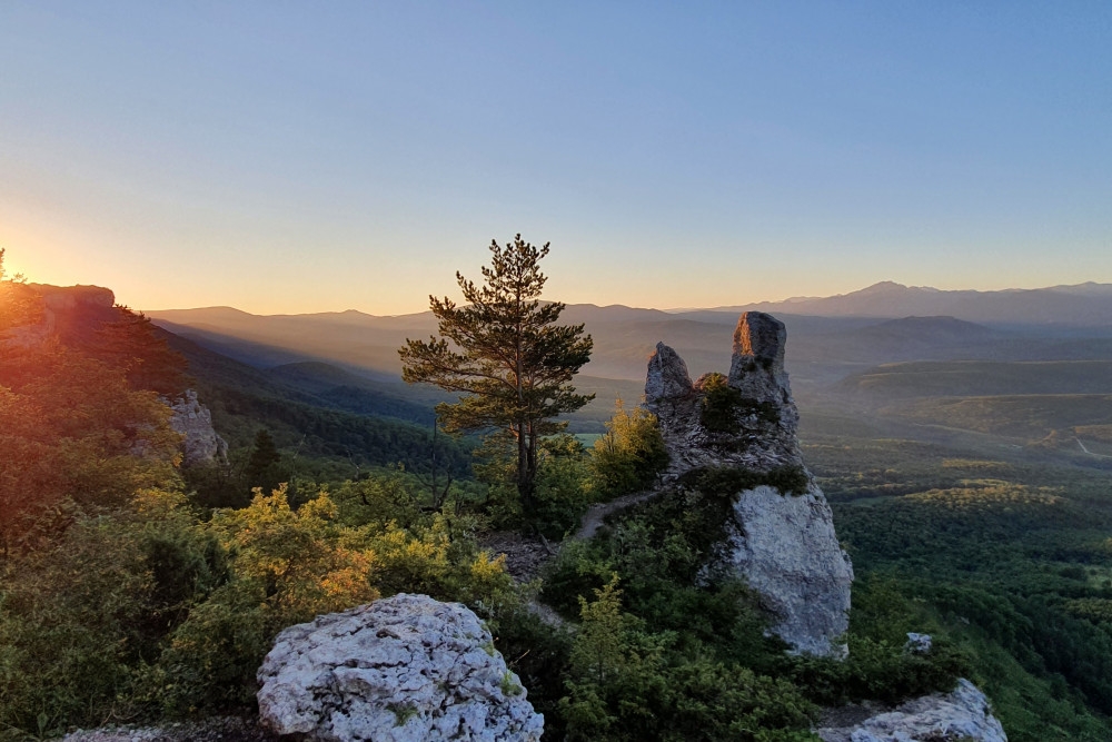 С левой стороны встают Фишт и Оштен — те самые великаны из Лагонаки, в снегу даже в мае. Рядом — Каменное море, хребет, по которому мы гуляли вчера. А если повезёт с прозрачным воздухом (такое бывает раз в несколько дней) — на горизонте проступит Эльбрус. Да-да, тот самый. Двуглавый. За сотни километров отсюда .