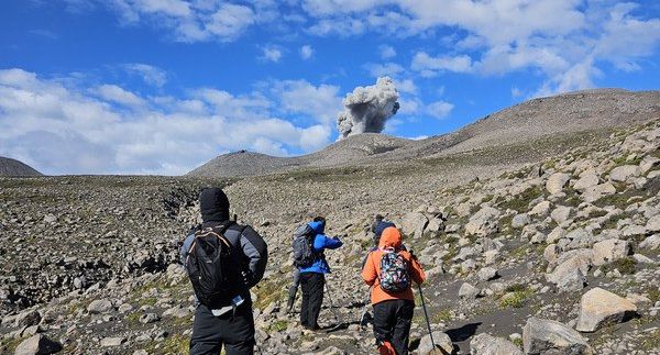 Объединенной группой восходим на извергающийся вулкан Эбеко с безопасной стороны