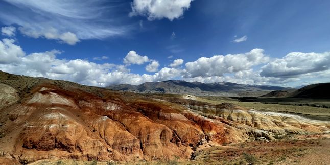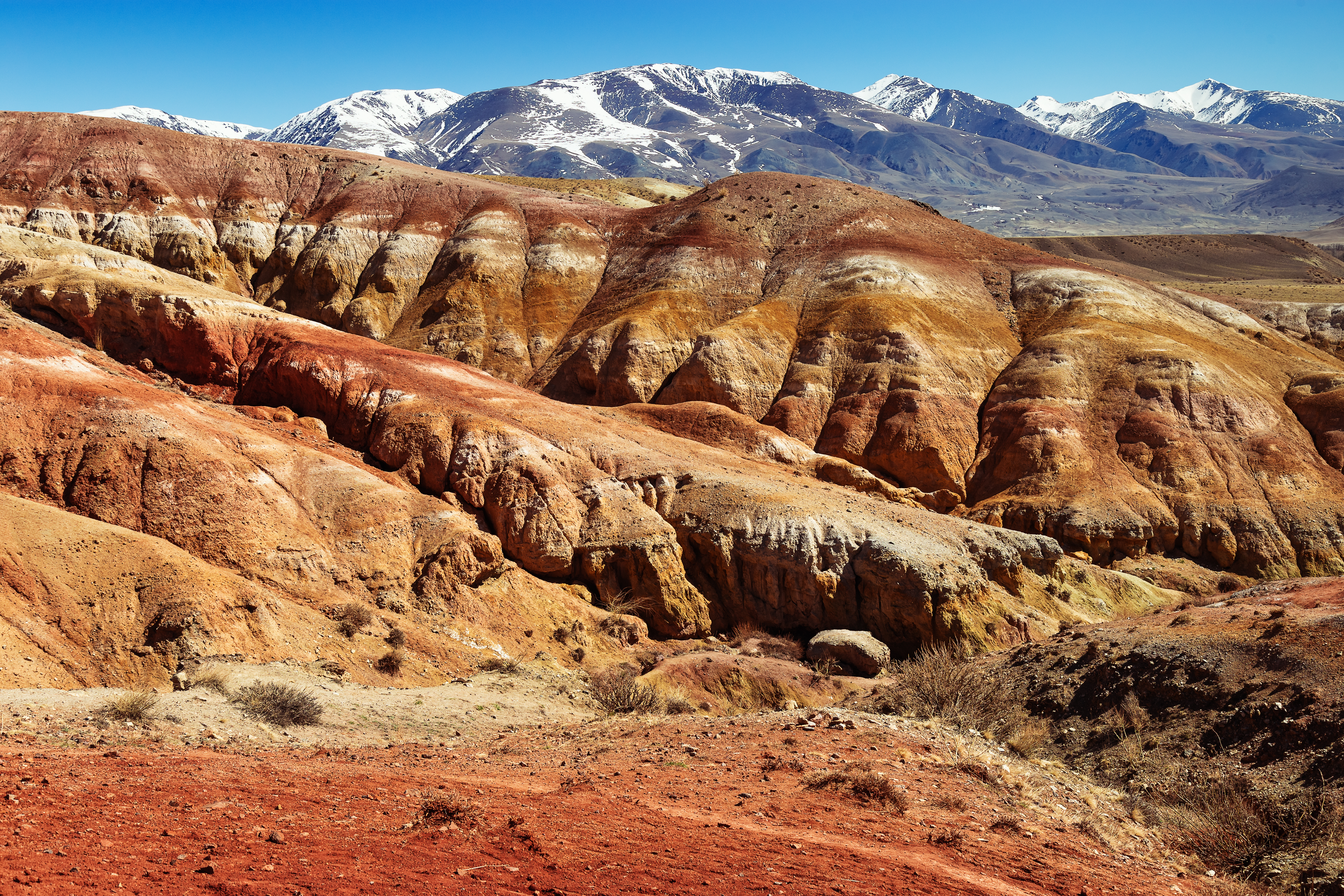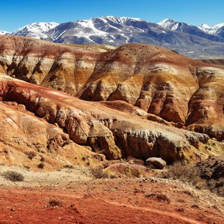 - Марсианские горы. Яркие полосатые взгорья и долины на фоне снежных склонов, резные тропы между красочными холмами — мы будем будто на другой планете