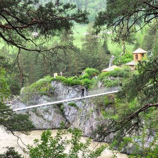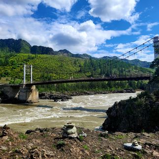 Далее наш путь лежит к подвесному мосту над бурной Катунью. Вы почувствуете, как он слегка покачивается под ногами, а внизу стремительно несётся река. Отсюда открывается потрясающий вид на водную гладь и окружающие скалы.