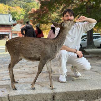 С утра — Нара. Это город, где олени живут как собаки. Они подходят, кланяются, берут печенье с руки. Это и мило, и весело, и фотогенично