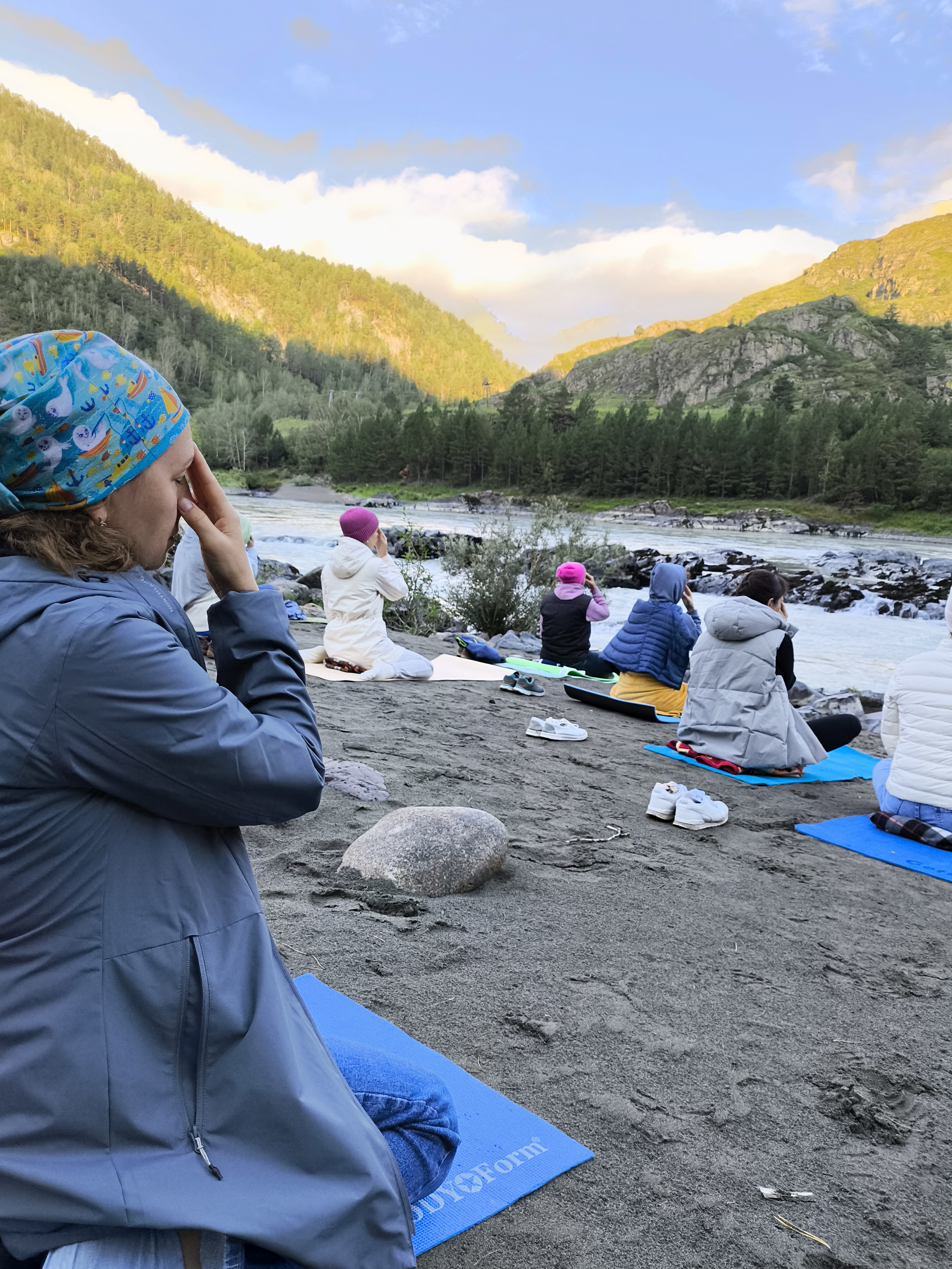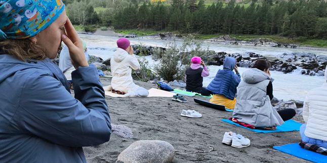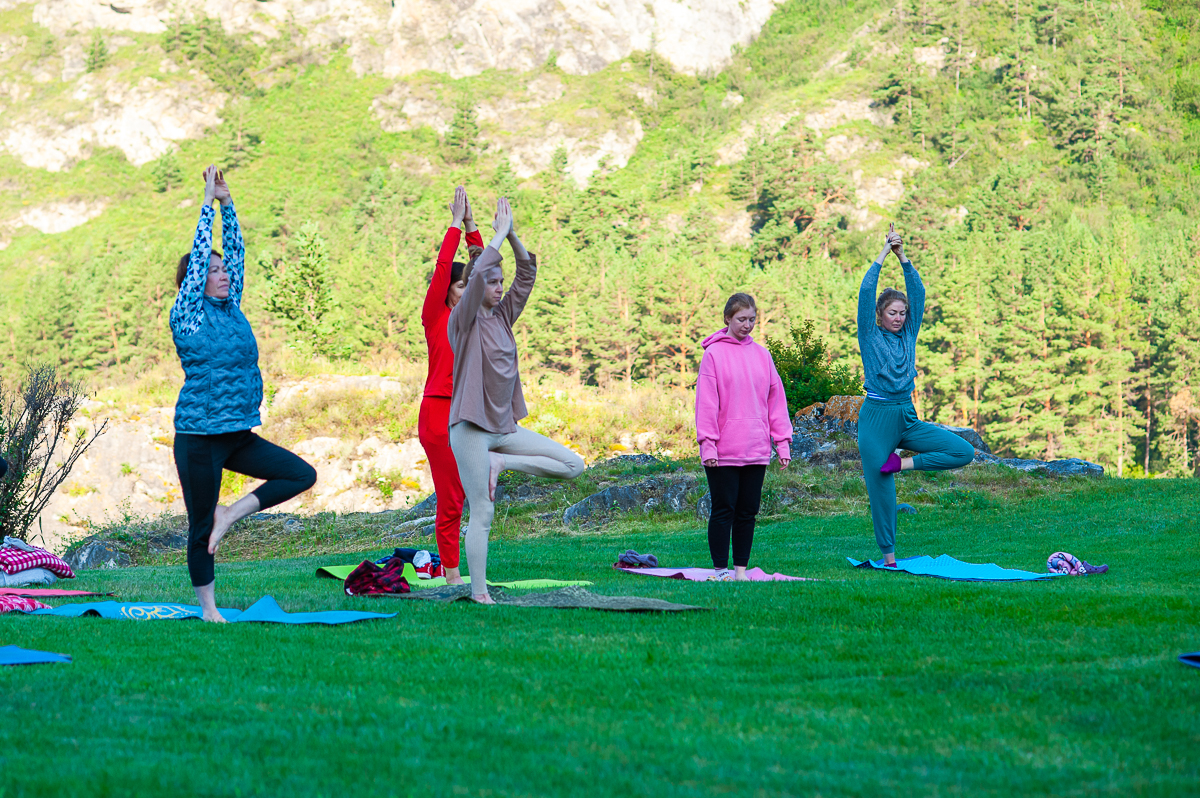 Для практиков утренняя медитация и пранаямы на берегу Катуни с 6.00 до 7.00. Для тех, кому это время слишком раннее утренняя практика с 7.00 до 8.30