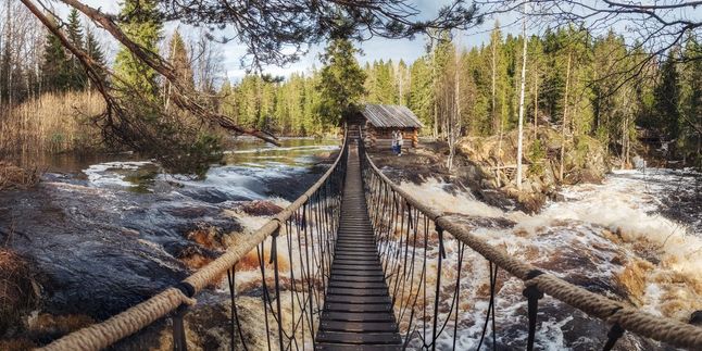 В 9:00 отправимся в горный парк «Рускеала». Расстояние 260 км, проехать предстоит 3,5-4 часа. По дороге гид будет рассказывать про историю Карелии, а вы сможете полюбоваться старинными деревушками и живописными видами. Посетим Рускеальские водопады, где снимали фильм «А зори здесь тихие…» По желанию и за доплату вы можете пройтись по экотропе — навесным деревянным мостикам прямо над водопадами.