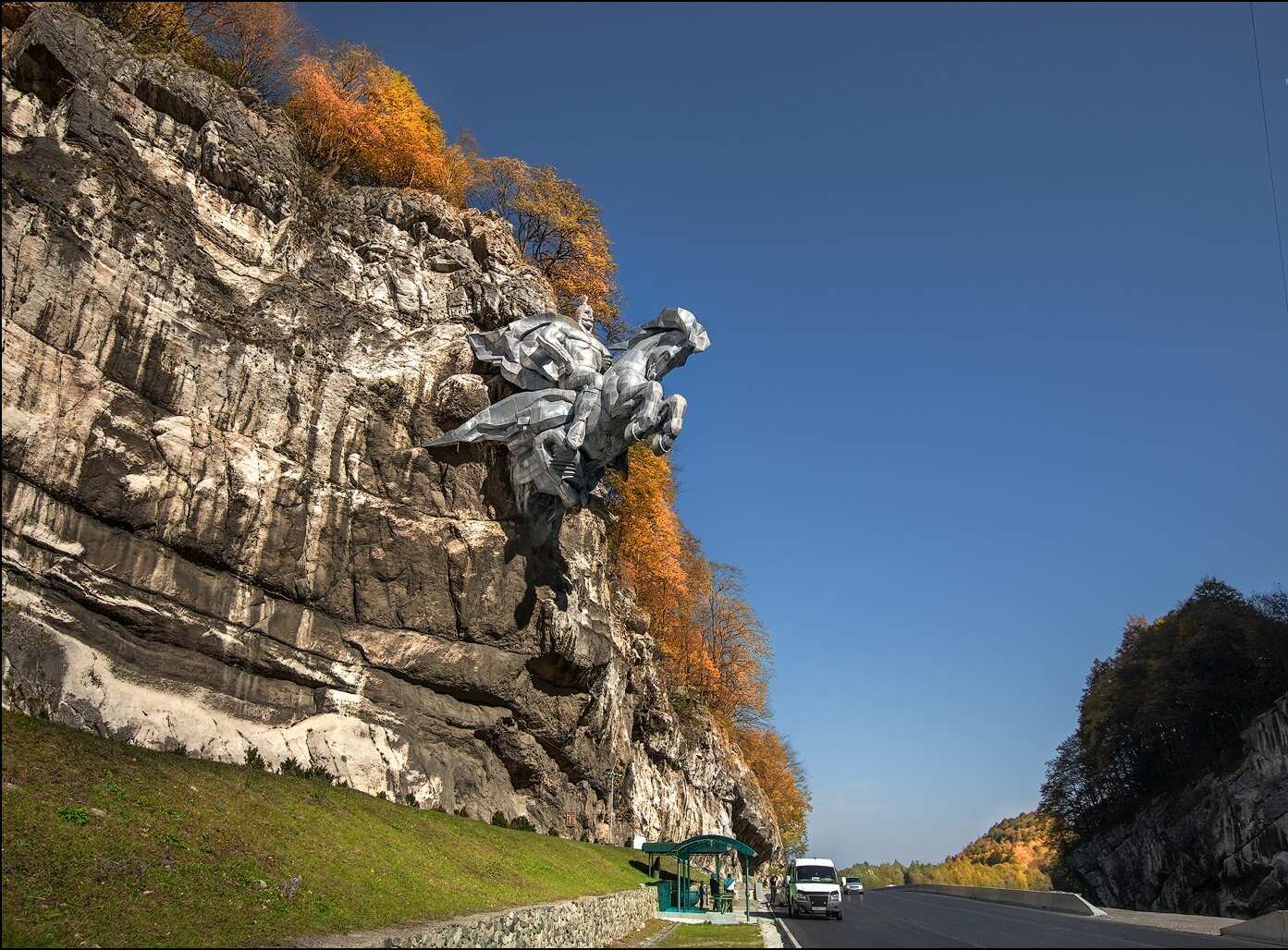 Побываем у конного памятника Уастырджи, словно вырывающегося из скалы прямо над дорогой. Герой монумента — ключевая фигура нартского эпоса, в котором считается, что большинство кавказских народов произошло от мифических богатырей. Под статуей находится пещера с чашей для подношений, где принято оставлять монетки.