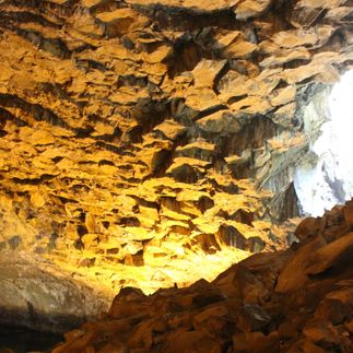 Мы посещаем серную пещеру с озером внутри кратера потухшего вулкана. Свет проникает через отверстия в камне, отражается в воде — и кажется, что мы в каком-то другом измерении.