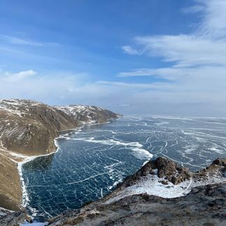 Бухта Ая : незабываемый вид на морскую Даль открытого ледяного Байкала , отвесные белые скалы , которые обрываются в самую глубину