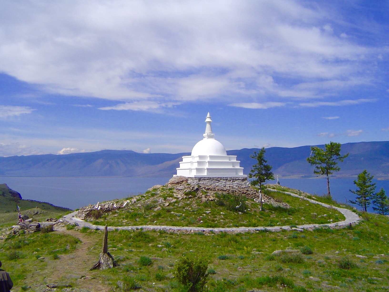 Этот остров, причудливо изгибающийся на просторах Малого Моря, с высоты похож на застывшую в танце богиню. А в области её сердца, на самой высокой точке, парит в небе белоснежная Буддийская Ступа Просветления. Спроектированная иркутским архитектором и освященная ламой из Бутана, эта ступа стала плодом искренней веры людей со всего мира — от Нью-Йорка и Лондона до Москвы и Иркутска. Каждый кирпич, каждый камень для её строительства был поднят на вершину вручную, с молитвой и надеждой.