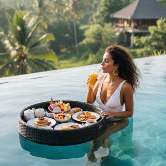 Утро начинается с того, о чём вы столько раз видели в Instagram - вас ждет знаменитый плавающий завтрак. Тропические фрукты, свежий сок и кофе на подносе прямо в бассейне. Идеальное время для первых кадров и ощущения настоящей роскоши.