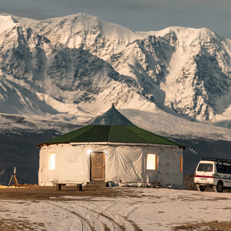Ночуем мы в уединённом круглом домике в Курайской степи с видами на снежные вершины Алтая. Баня.