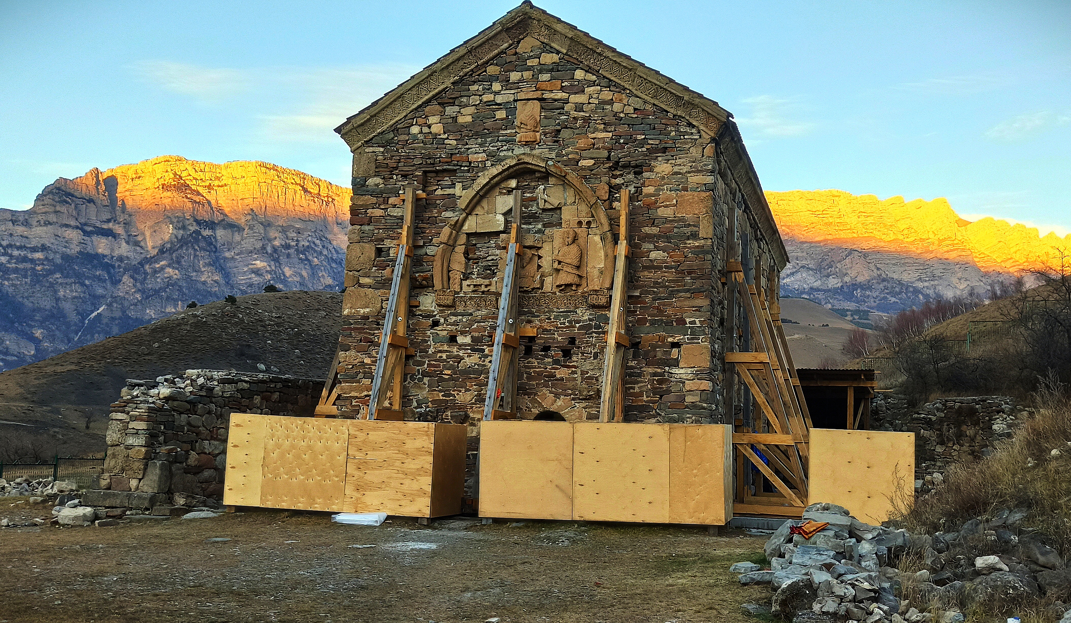На обратном пути осматриваем храм Тхаба-Ерды (Храм двух тысяч святых). Это древний христианский храм, построенный в 7-8 в. н.э. .Согласно легенде, в этом месте, на перекрёстке дорог, собрались две тысячи проповедников из разных земель и решили возвести общую святыню. Чуть выше храма расположена обзорная площадка на вершины Скалистого хребта