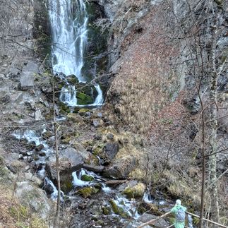 Берём с собой коврики и отправляемся по тропе на прогулку в сторону Ляжгинского водопада. Общая протяженность маршрута в одну сторону всего 1,4 км. Любуемся водопадом. Делаем незабываемые фотографии.