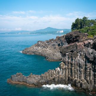 Далее посетим Базальтовые скалы Чусанчжолли — Лава и море застыли здесь в форме идеальных шестиугольников, создавая пейзаж, который выглядит как искусственная архитектура, но создан самой природой.