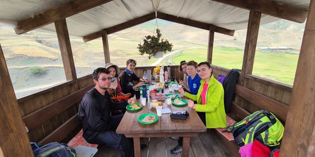 Ездили с дочерью в начале августа в Безенги. Группа была небольшая, всего 5 человек. С нами был руководитель Равиль и гид Антон. Организация была на высшем уровне. Встреча, трансфер до альплагеря и размещение в лагере. Готовили еду все вместе, питание было очень разнообразное и сытное.
