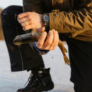 Заключительный день — спокойный, но с характером. Зимняя рыбалка на озере: палатки, снасти, эхолоты, гида и свежий улов. Горячий обед прямо на льду, уха, мясо на углях и та самая атмосфера мужской тишины.