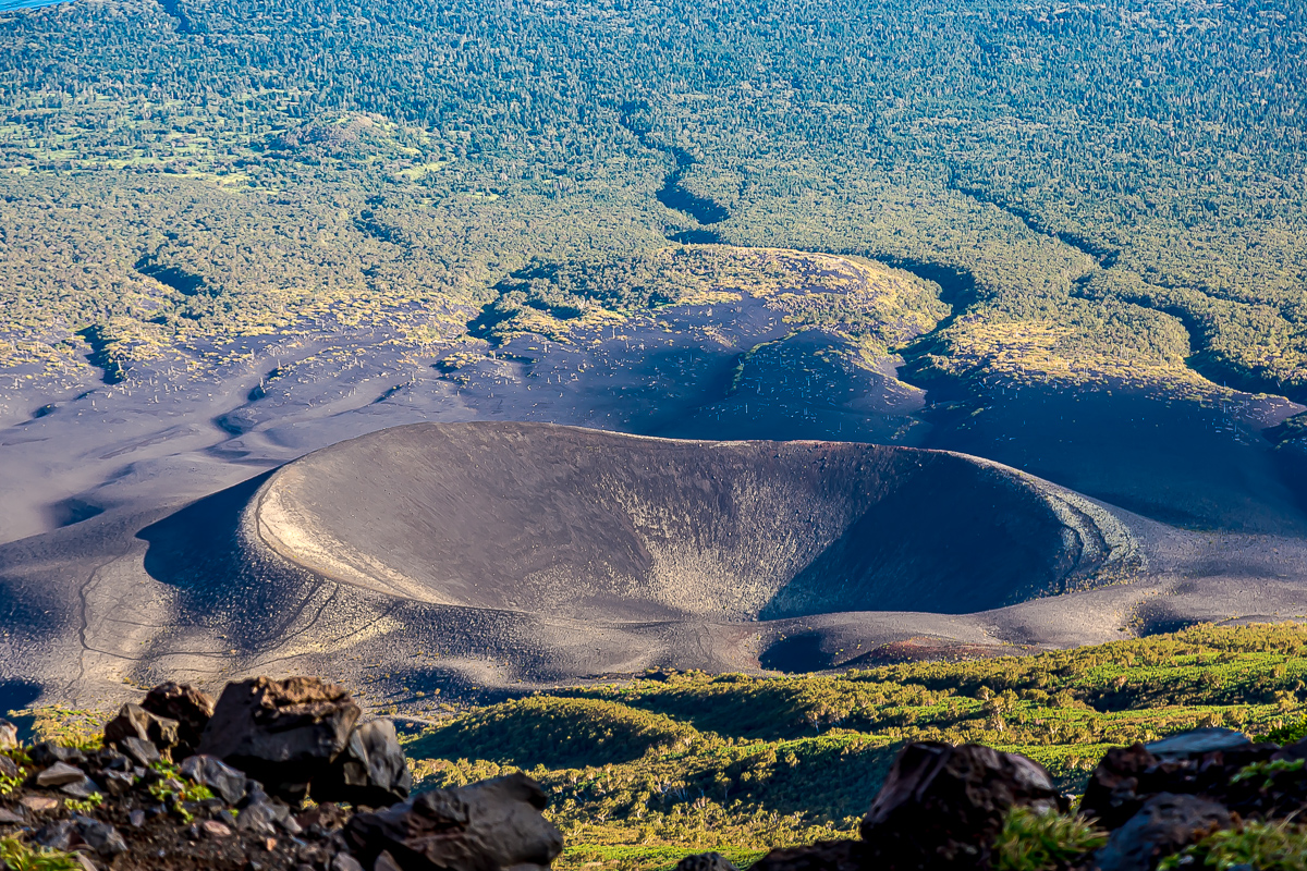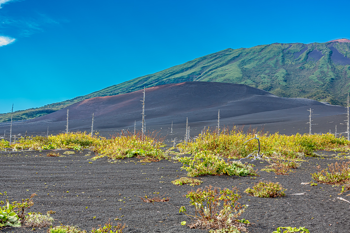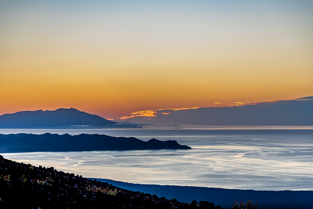 Утро третьего дня экспедиции к вулкану мы встретим с видом на Шикотан и Итуруп. После завтракасобираем палатки и начинаем спуск к побережью. Обратный путь к океану позволит еще раз спокойно рассмотреть мертвый лес и участки сошлаковыми полями, мимо которых мы проходили в первый день.