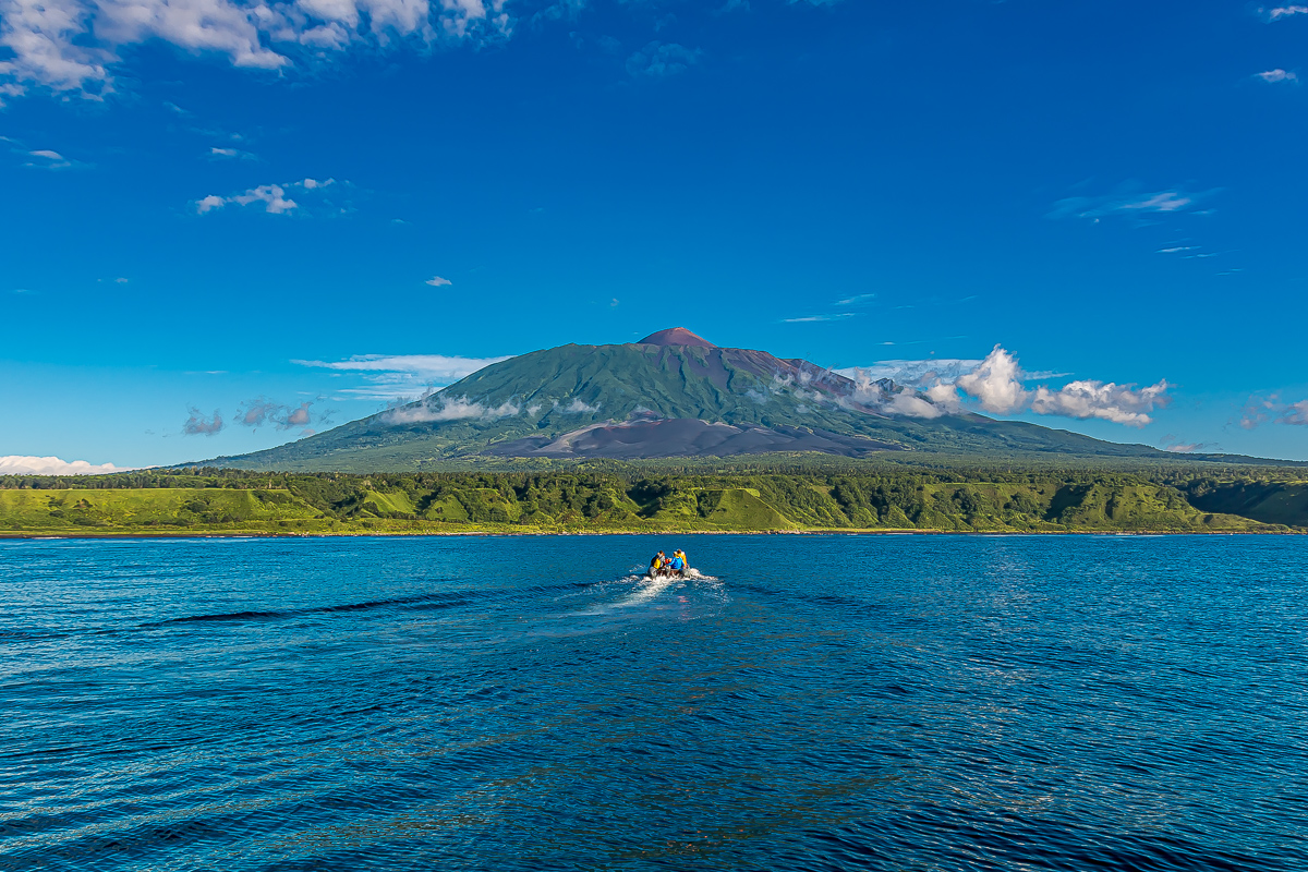 Постепенно на горизонте начнет проступать силуэт нашего следующего пункта назначения острова Кунашир. Нам откроются его самые труднодоступные и легендарные вершины, которые практически невозможно увидеть во время обычных экскурсий: грозный вулкан Руруй и один из самых красивых вулканов мира величественный Тятя.