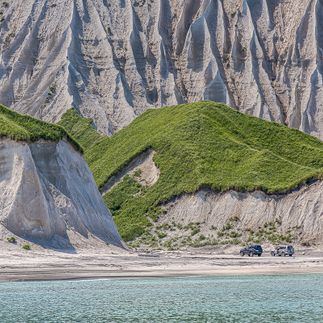 После прогулки мы увидим главную жемчужину Итурупа - ослепительные Белые скалы. Этот массив из мягкой светлой пемзы возник после извержения вулкана Баранского. Ветер и вода веками высекали здесь причудливые каньоны, превращая берег в инопланетный пейзаж. Белоснежные обрывы эффектно контрастируют с черным вулканическим песком и ярко-зелеными вершинами. По пути мы посетим Черные скалы уникальные базальтовые колонны пятигранной формы. Это место гарантирует вам лучшие кадры из всего путешествия.