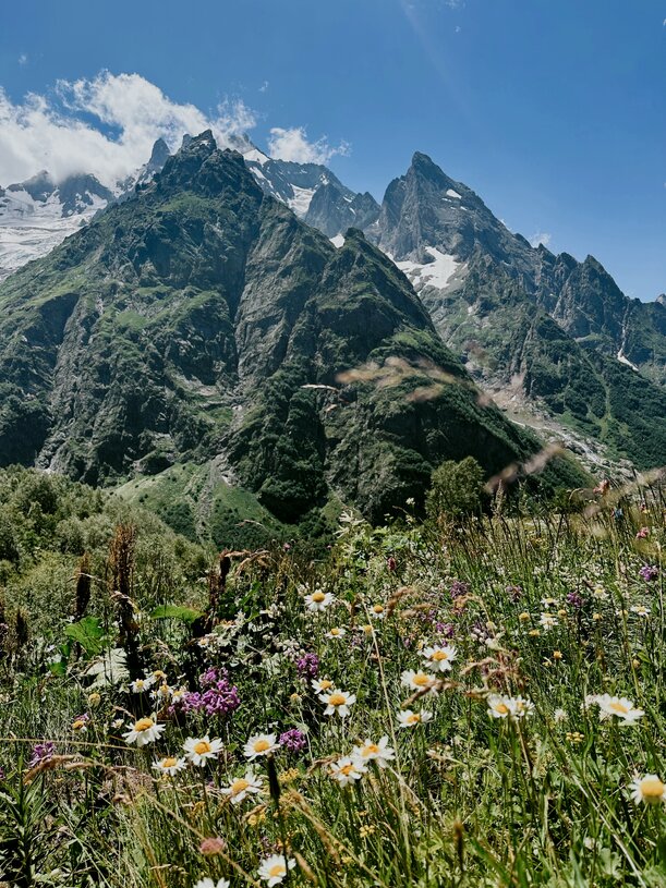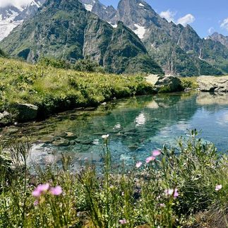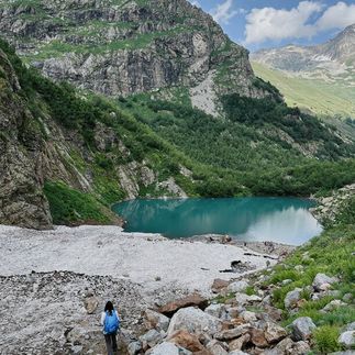 Сегодня мы увидим ледник, шумный водопад и бирюзовое горное озеро. Из Домбая на высокопроходимых автомобилях доедем до альплагеря Алибек, откуда дальше, уже пешком, отправимся к Турьему озеру и виду на величестыенный ледник Алибек с обзорной площадки.