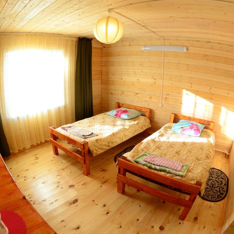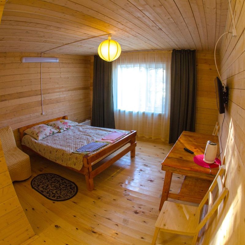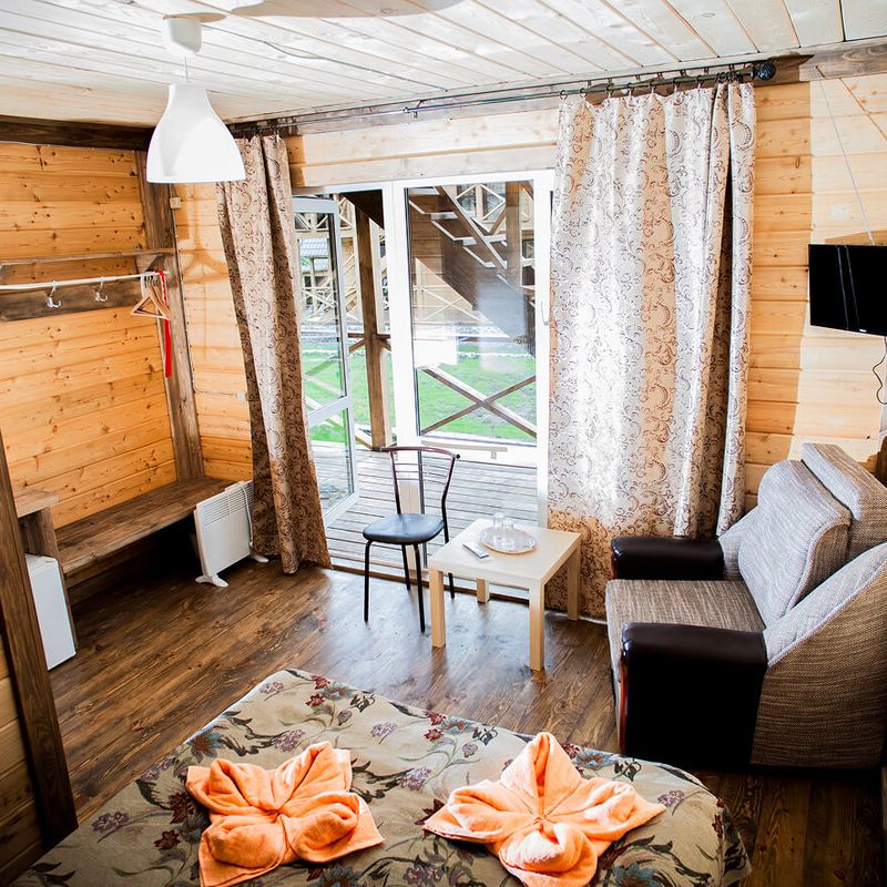 - Проживание в 2-местных домиках и номерах с удобствами;