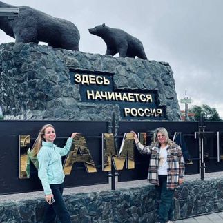 Знакомимся с гидом‑водителем — и сразу в путь! Первая остановка — арт‑объект «Здесь начинается Россия». Представьте: перед вами — медведица с медвежонком, словно живые, а за ними — величественная цепь из пяти вулканов. Это не фото, это реальность!