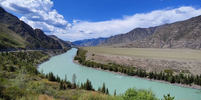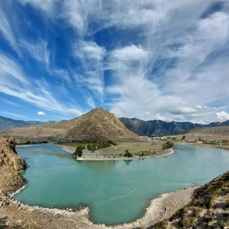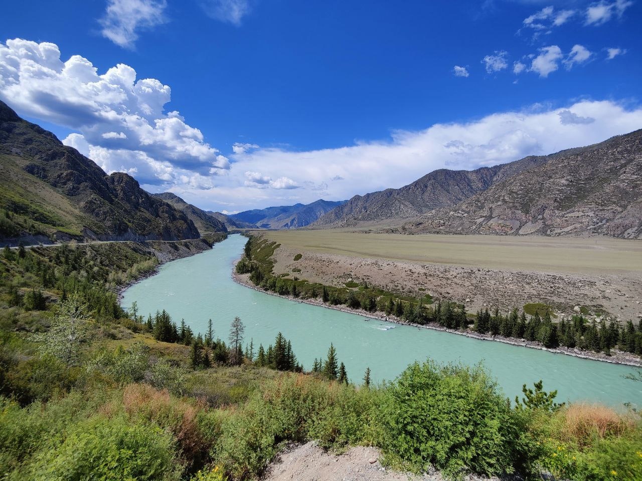 Слияние рек Чуи и Катуни — священное место, где две могучие реки встречаются, создавая удивительный природный феномен: их воды текут рядом, не смешиваясь, создавая поразительный контраст цветов!