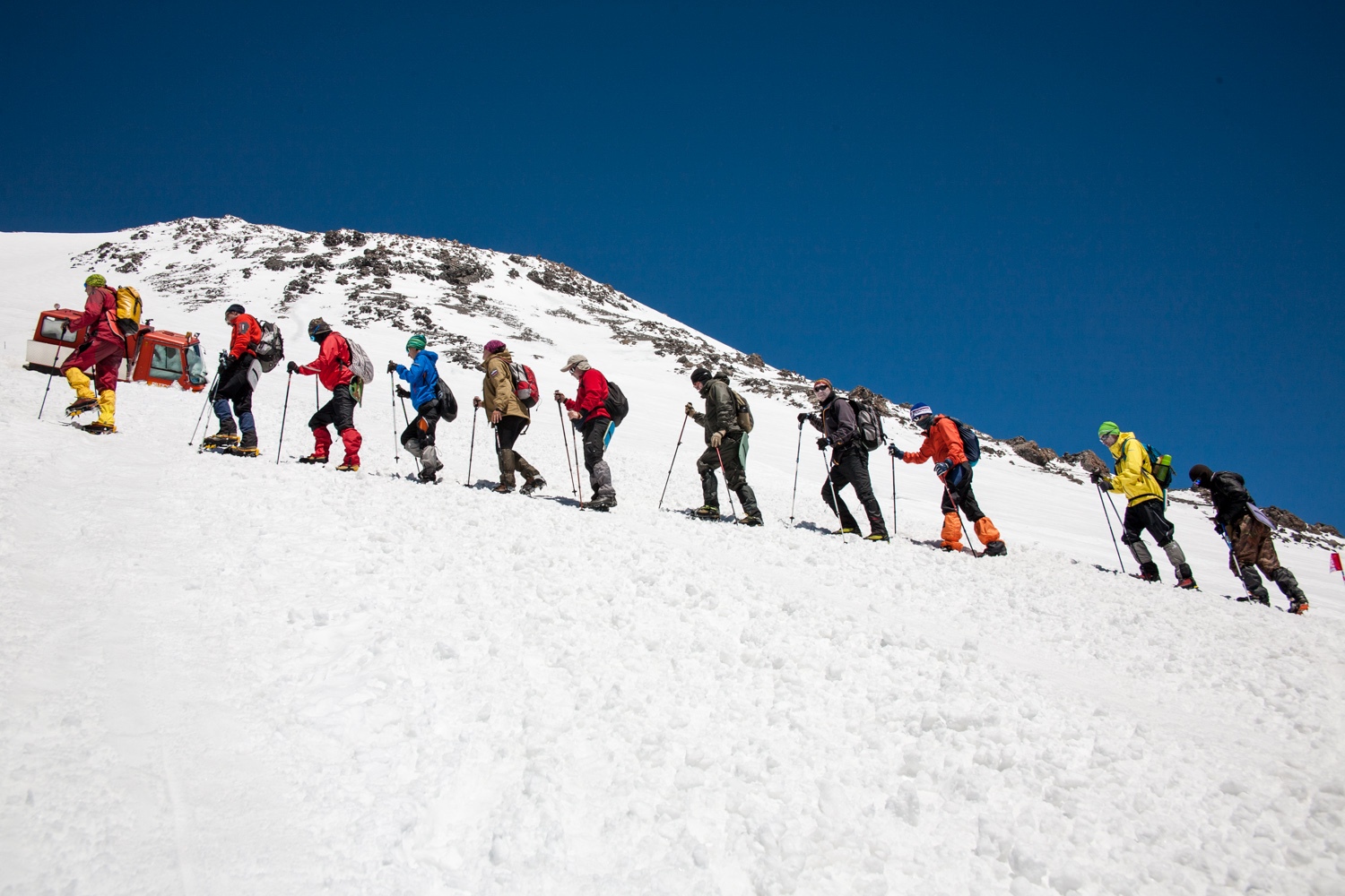 Уже со всем снаряжением поднимемся до самой высокой в Европе канатной станции - Гарабаши (3 850м). Здесь мы погрузим наши вещи в ратрак, а сами налегке поднимемся пешком до нашего горного приюта на высоте 4 100 м. Разместимся в горном приюте, перекусим, после чего нам предстоит контрольный акклиматизационный выход до высоты 4800-5000, в зависимости от состояния группы и погодных условий.