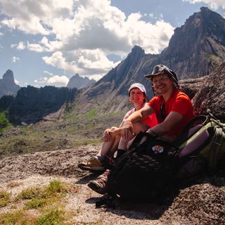В этот день мы выходим без рюкзаков, совершаем кольцевой маршрут через 3 перевала: Спящий Саян, Тайгиш-2 и Художников. Делаем остановку на перекус на озере Художников с видом на скалу Парабола.