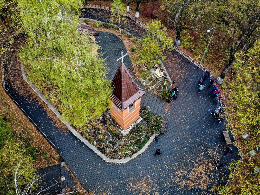 Сначала пройдём к святому источнику Великомученика и Целителя Пантелеймона, бьющему — удивительное дело — практически с вершины горы. Рядом оборудована купель для всех желающих.