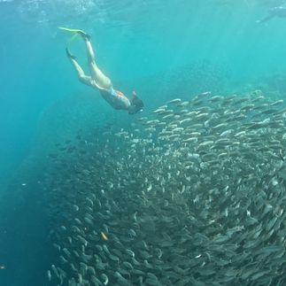 Уже утром мы надеваем маски и погружаемся в мир океана: рядом с нами величественно проплывают огромные морские черепахи , а чуть дальше оживает настоящее чудо природы — миллионы серебристых сардин, которые движутся в унисон, создавая гигантские живые фигуры прямо вокруг нас. Это ощущение, будто попал в другую вселенную.