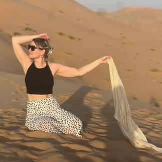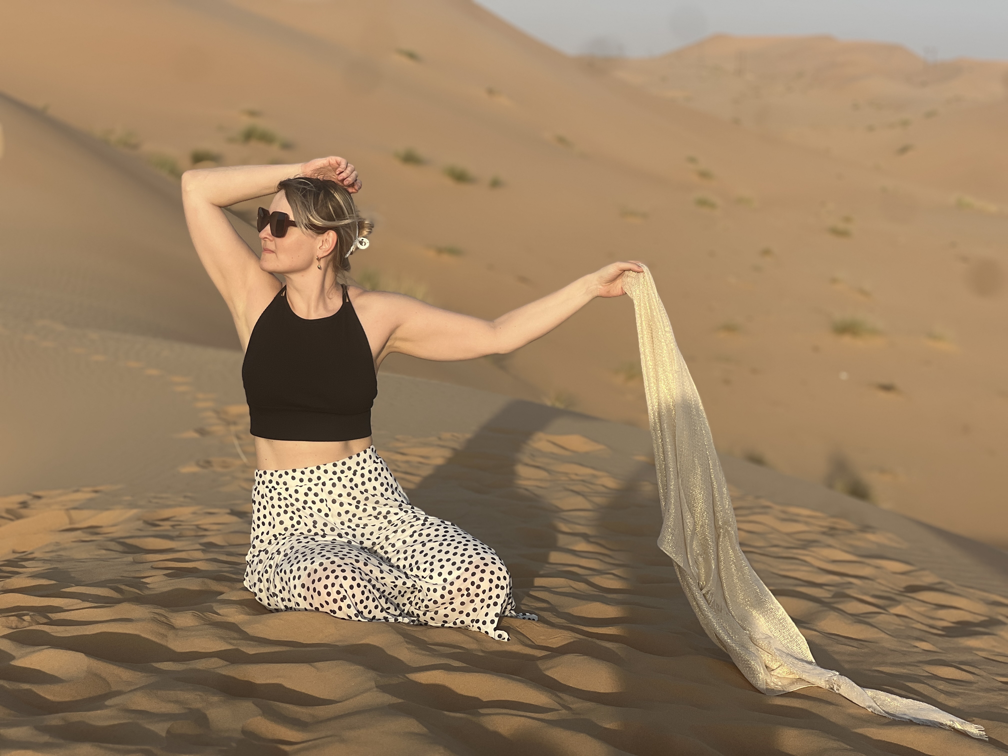 Здесь нас ждёт третья фотосессия - на фоне песчаных барханов и золотого заката - та самая атмосфера арабской сказки, ради которой едут в Дубай.