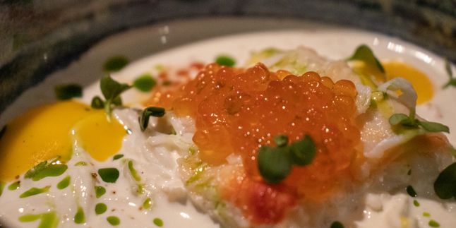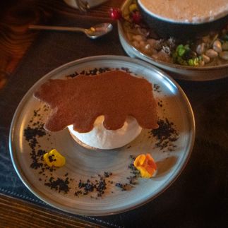 Меню: сыровяленая дичь: окорок оленя, филей утки и мясо глухаря с муссом из хрена, чёрная паста с щупальцами кальмара и крой тобико, десерт Морошка&Кедр под снегом, черный чай с черникой и ягодой асаи.