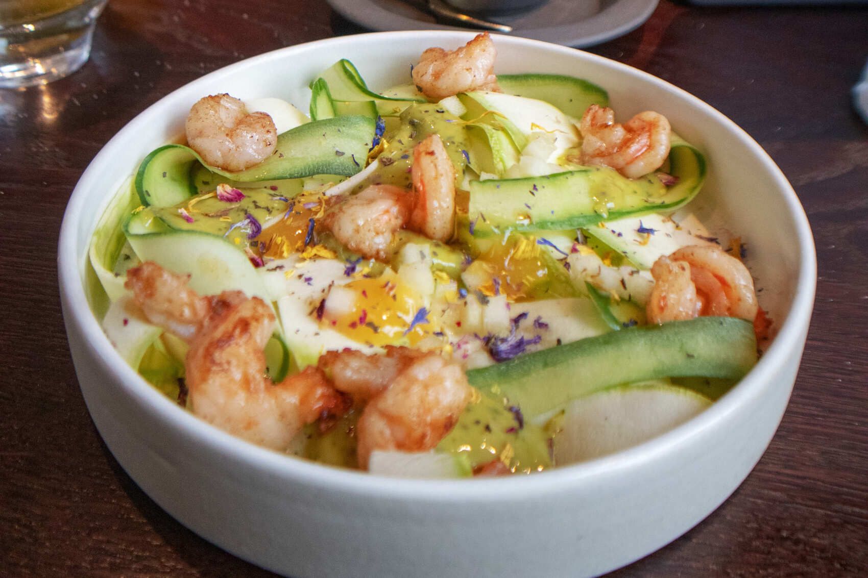 Меню: Салат с креветкой и кабачком, лесной грибной крем-суп с томлёной олениной, фаланга краба запеченная / птитим / кукурузный мусс, тарт с морошкой / крем-брюле, чай.