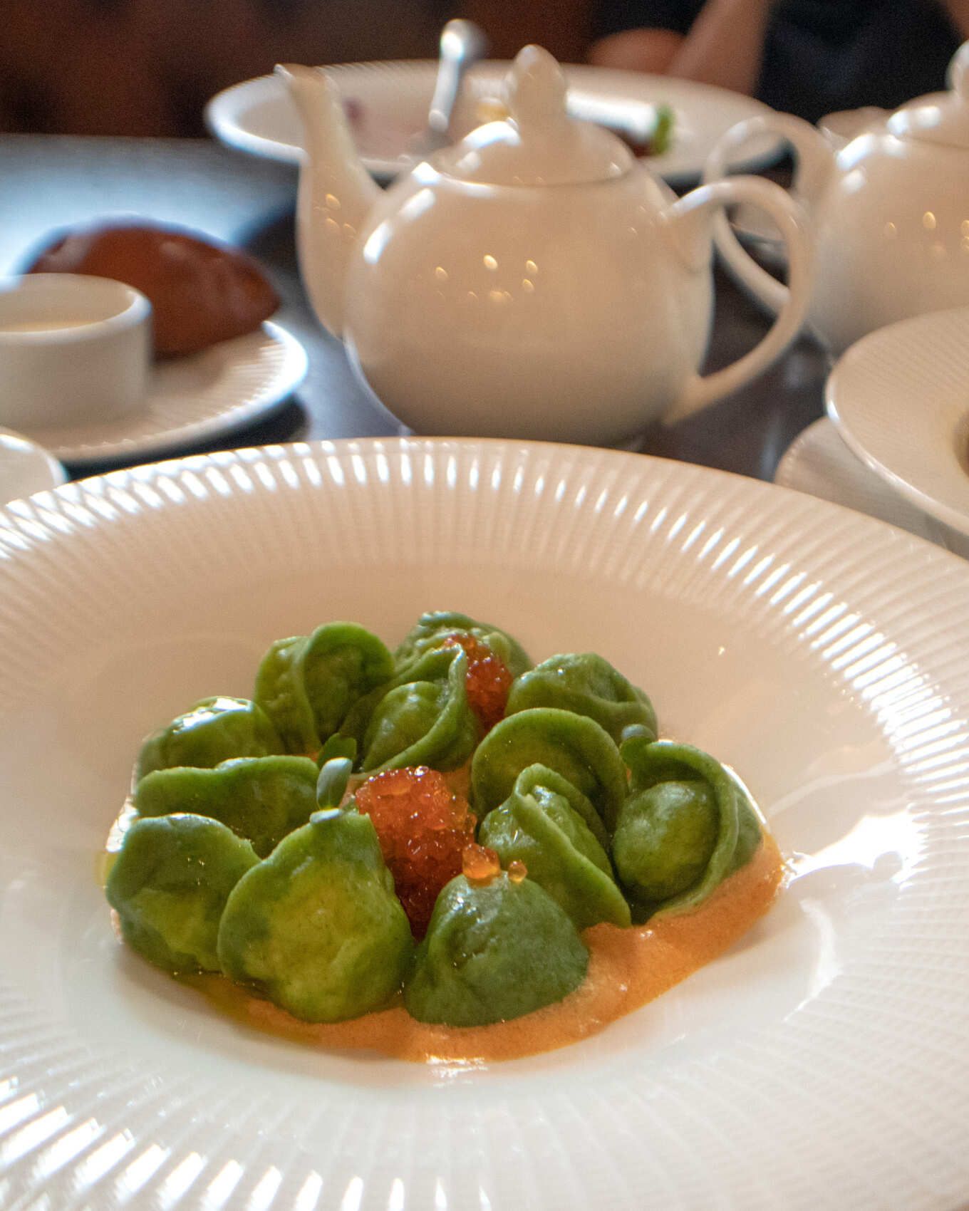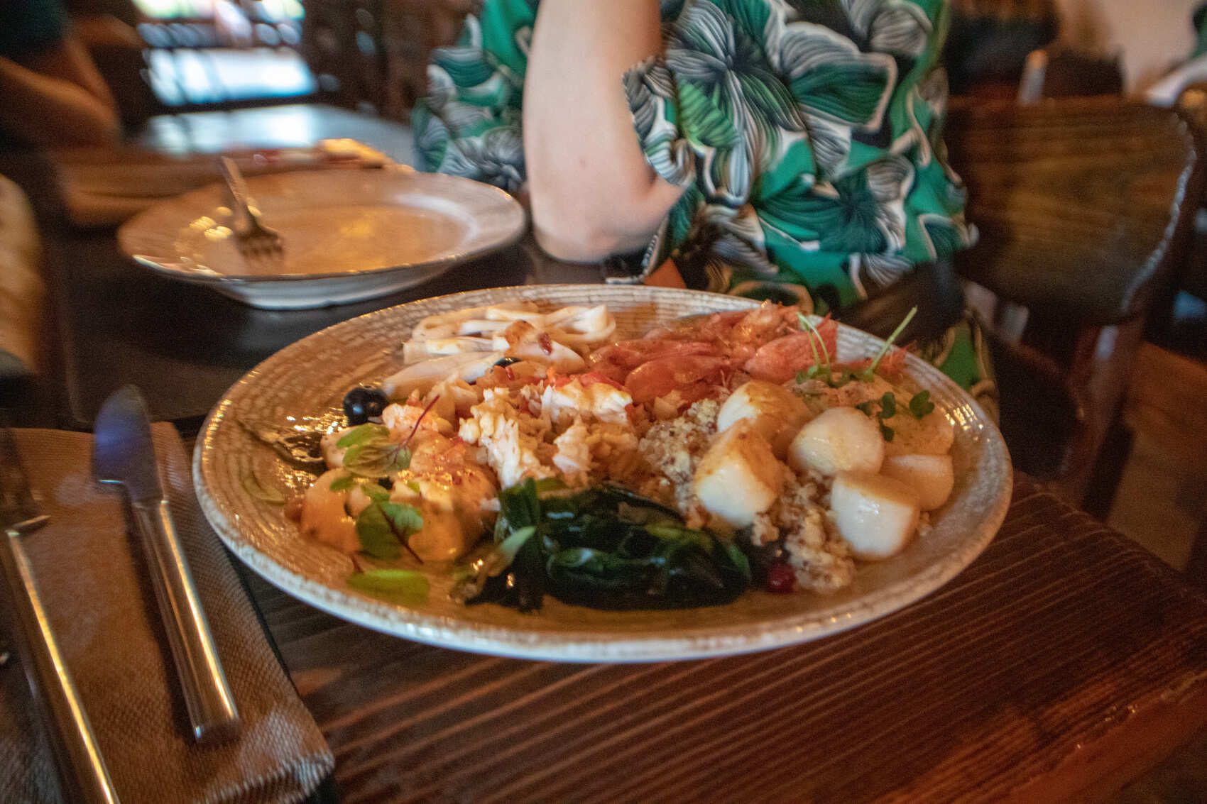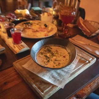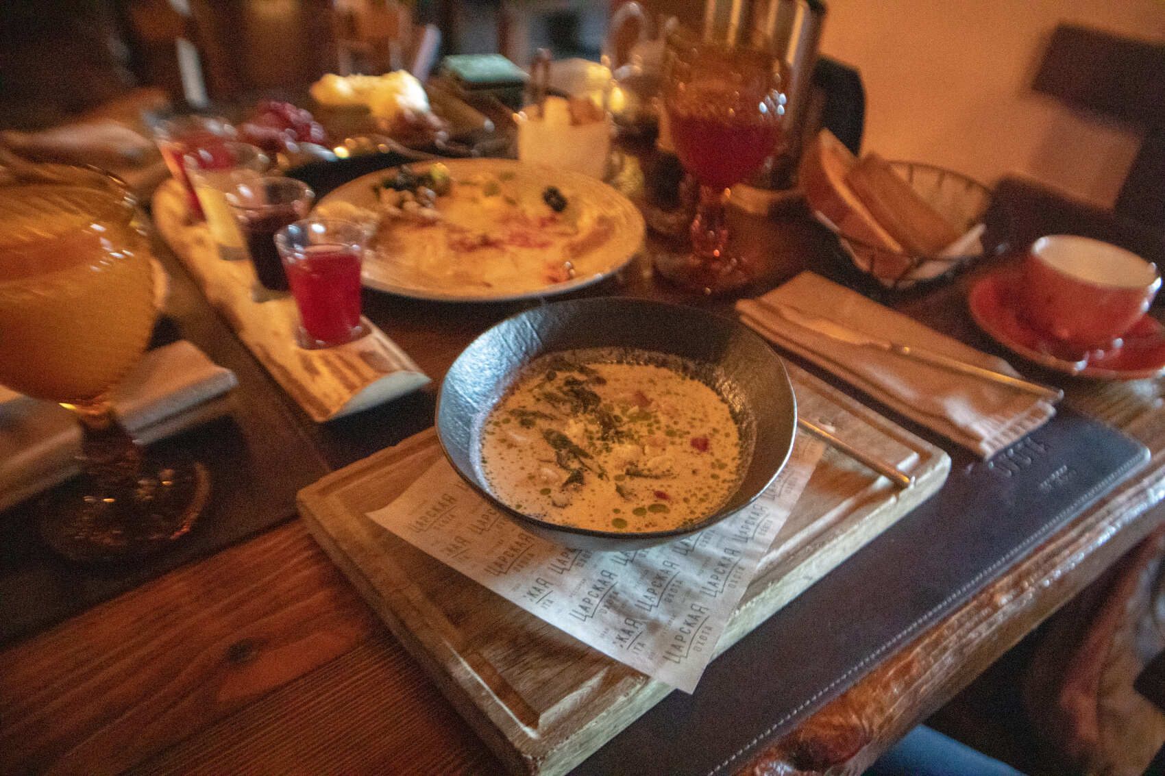 Примерное меню: салат Куэльпорр с олениной, суп из лесных грибов, пельмени с крабом, таежный травяной сбор.