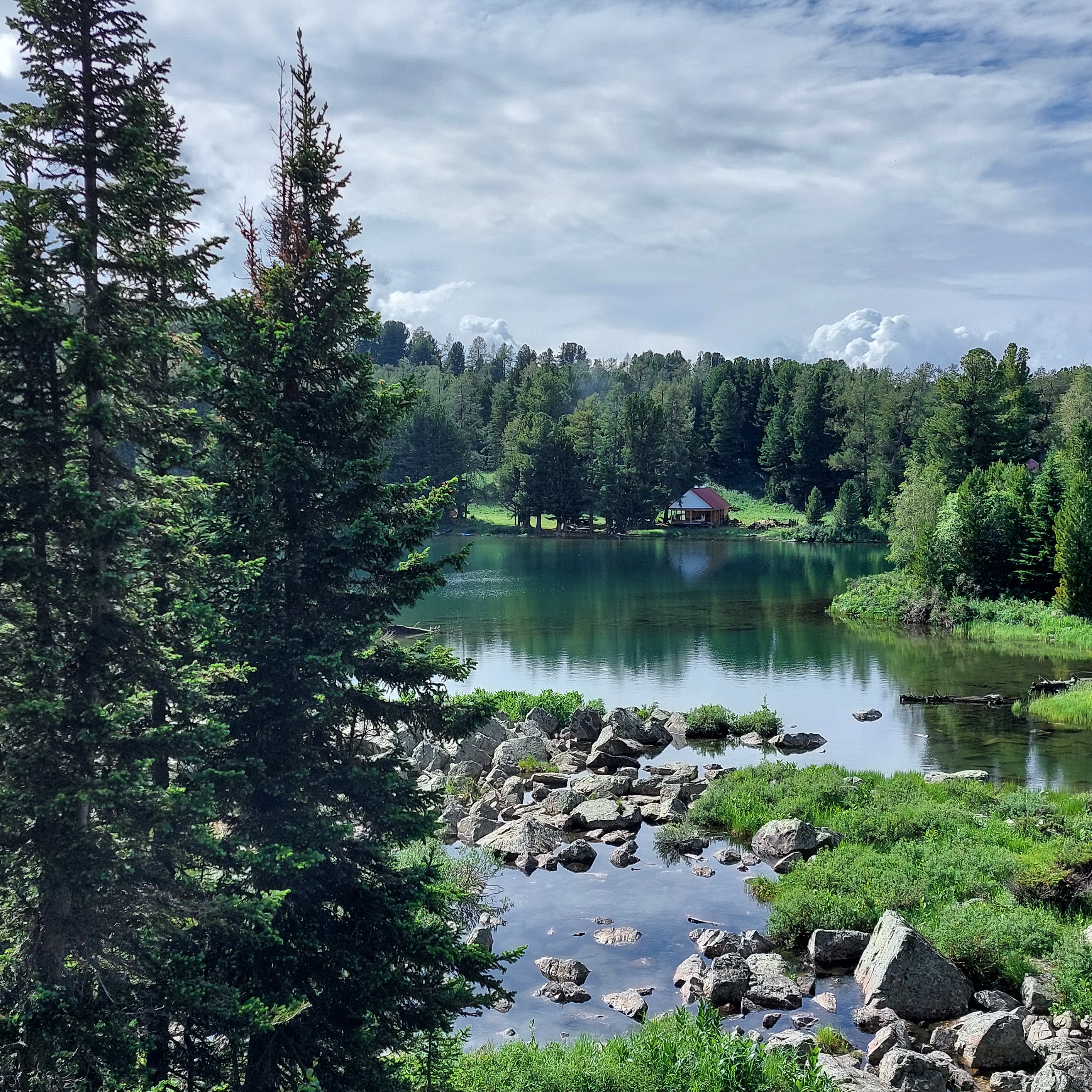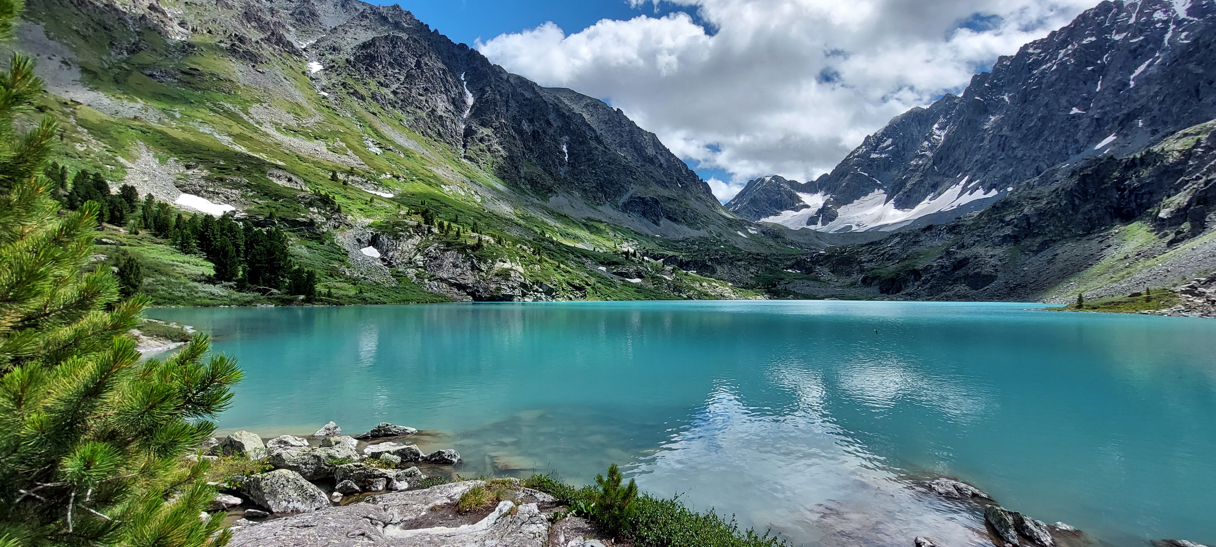 Дополняют эту красоту, как обычно, горы, голубое небо, белые облака и скромные кедры, которые растут возле озера и любуются им.