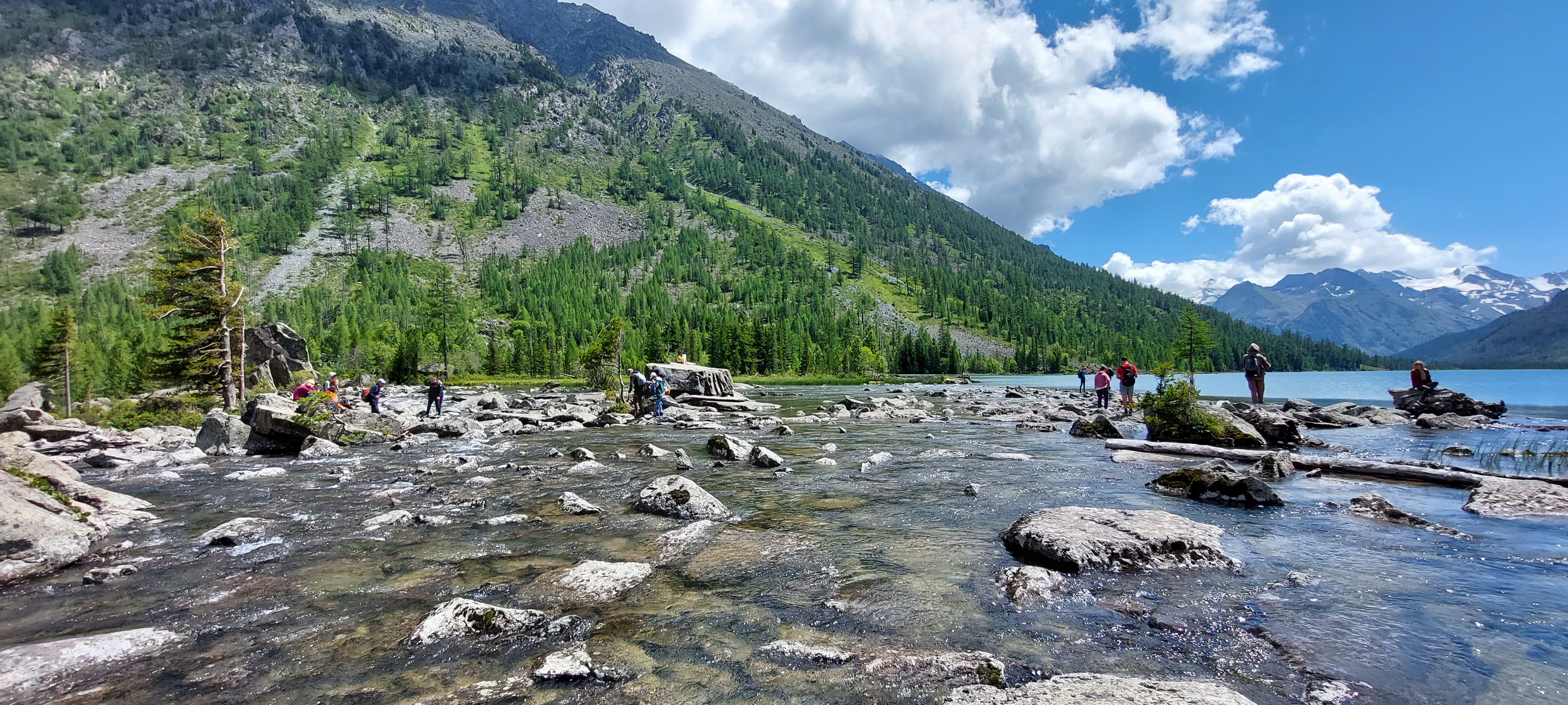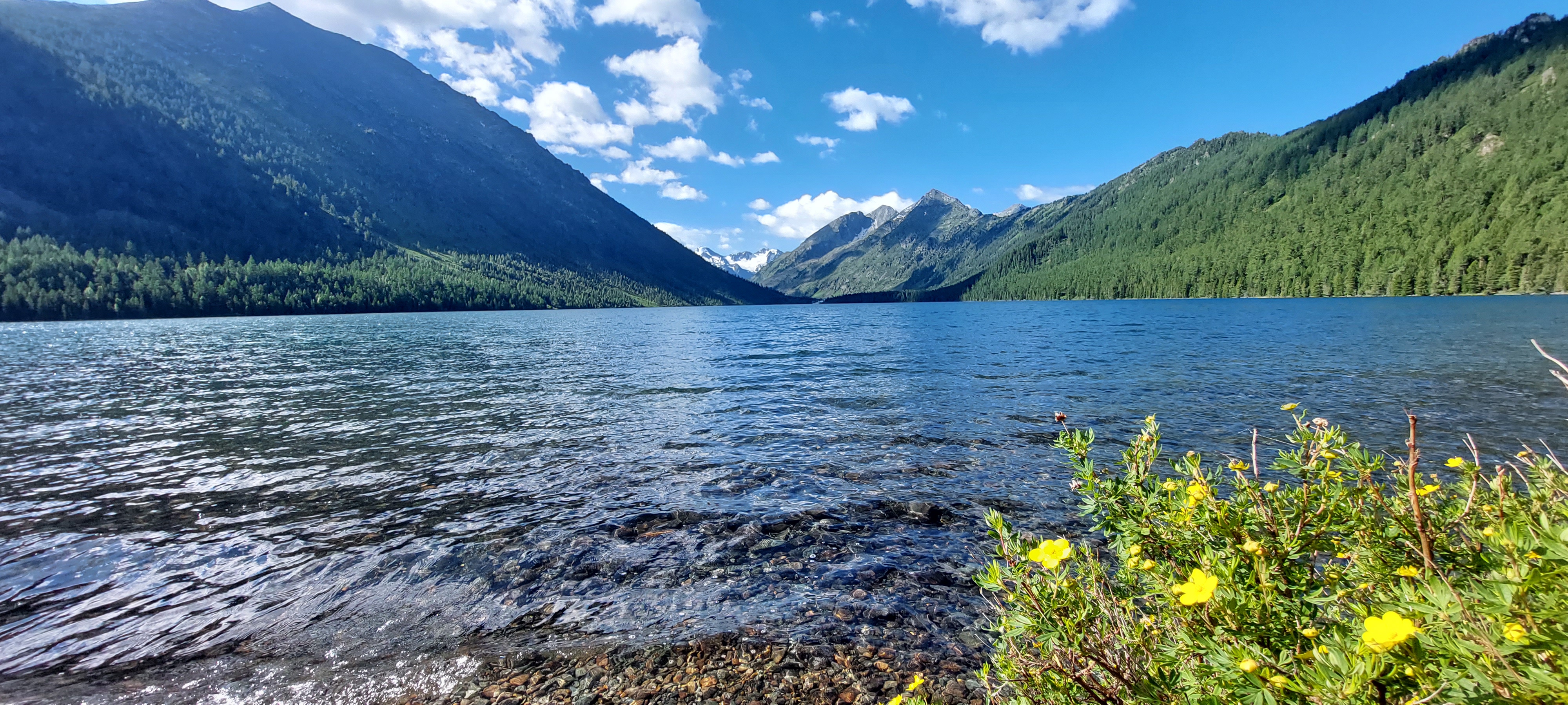 И вот они, перед нами горы Алтая! Те самые, которые Вы видели на картинках и мечтали увидеть воочию! Живописные горы, которые от пят и почти до самой макушки покрыты кедрами. А у подножия гор плещутся озера. Наш лагерь будет расположен близко от Нижнего Мультинского озера. Сюда всегда можно прийти утром, чтобы полюбоваться, как озеро просыпается и над ним рождается туманная дымка. Здесь же можно любоваться вечерними красками, когда солнце освещает золотом верхушки гор и плавно уходит за горизонт. В наших планах в этот день поход на перекат Шумы. Пройдем по лесу вдоль Нижнего Мультинского озера. Между прочим, длина озера 2300 м!! Это вам не просто скромный, горный водоем. Это роскошное озеро Алтая))) Чуть выше Нижнего располагается Среднее Мультинское озеро. Между собой озера соединяются огромным перекатом Шумы. Местами он похож на водопад, местами на широкую и спокойную реку. Живописность этому месту придают большие и малые камни, которые хаотично лежат в воде и красуются перед туристами. На перекате Шумы погуляем, сделаем множество снимков и отправимся в обратный путь.