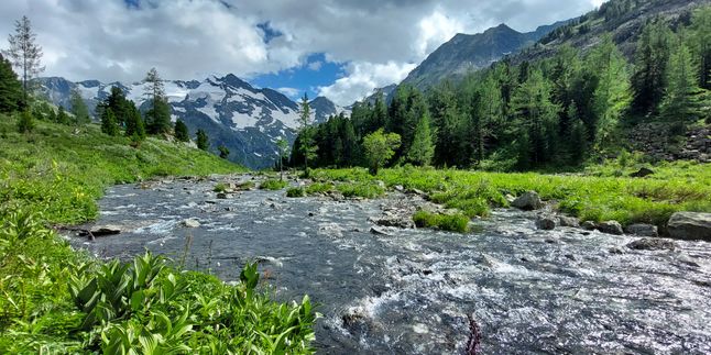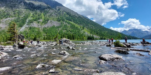 Чтобы дойти к Поперечному озеру, мы переплывем на катере Нижнее и Среднее Мультинское. Дальше пойдем пешком. Местами нужно будет пересекать небольшие речушки, пройдем по лесной зоне, по альпийским лугам. И во второй половине дня выйдем к нашей цели.