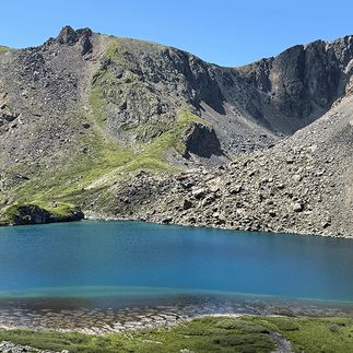 Поднимаемся еще чуть выше, чтобы посмотреть на него сверху. Постепенно зайдем за морену, за которой скрывается Голубое озеро. Впрочем, в разные месяца цвет озера меняется от зеленого до голубого)). В июне в озере еще могут плавать льдины, а затем оно полностью освобождается от ледяных оков.