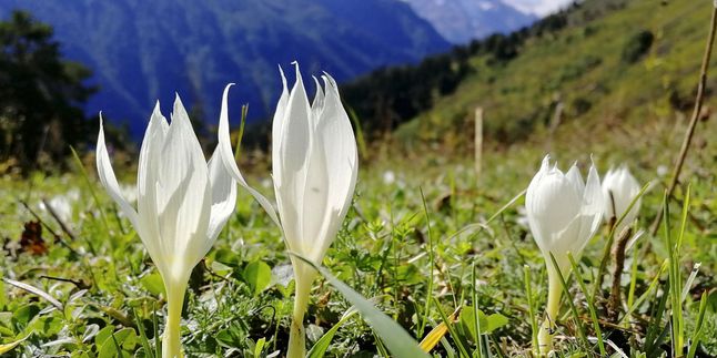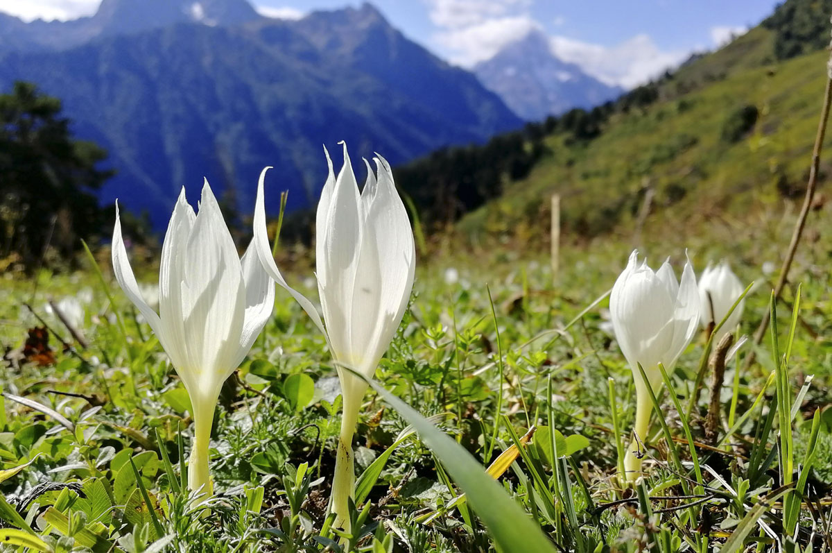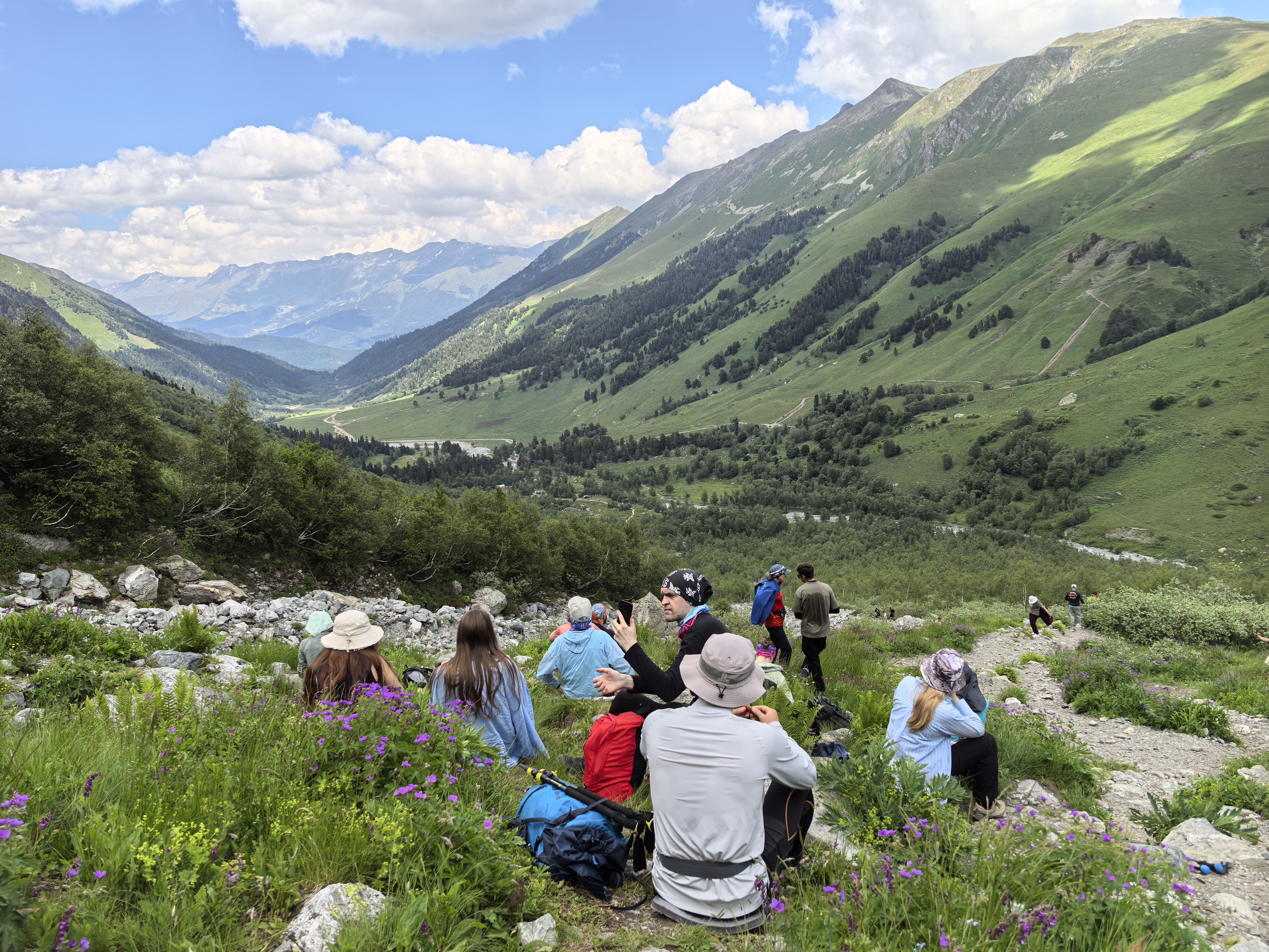 По пихтовому лесу, вдоль реки Орленок, тропа поднимет нас на Софийский хребет. Пройдя лес, выйдем в нашу любимую зону альпийских лугов, на огромную цветочную поляну! Это место прекрасно летом, здесь всегда цветут цветы. Наши снимки украсят желтые девясилы, фиолетовые флоксы, голубые незабудки, белые крокусы.