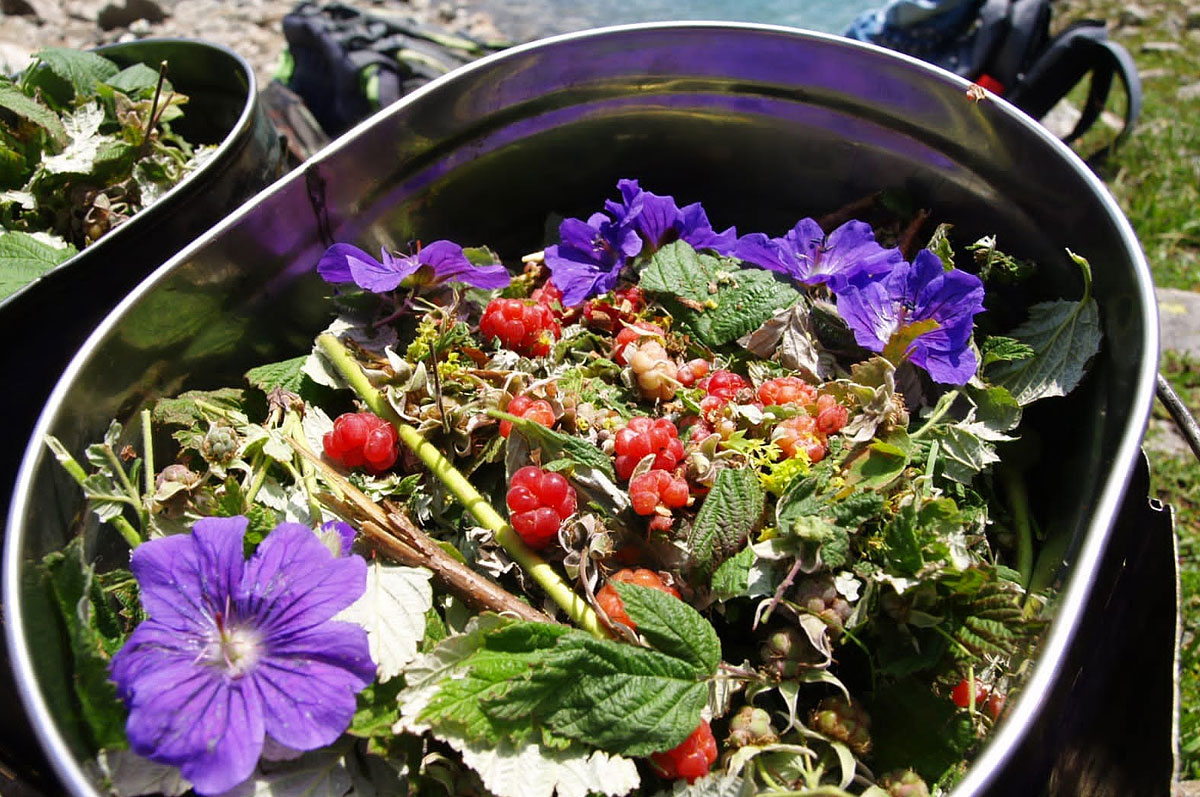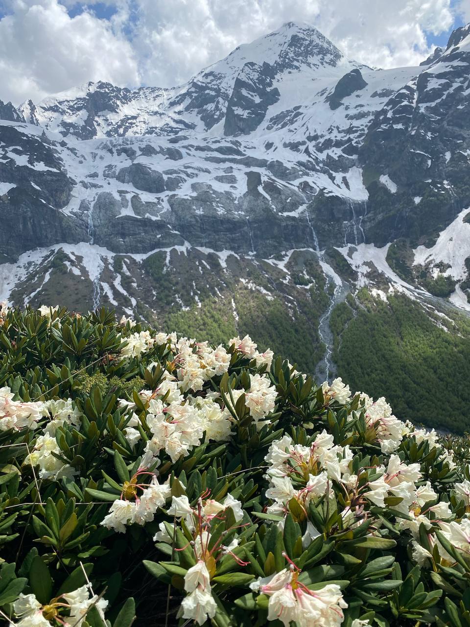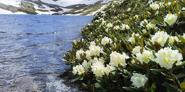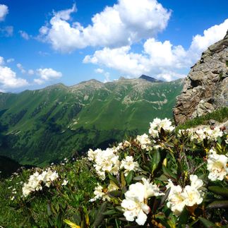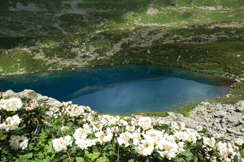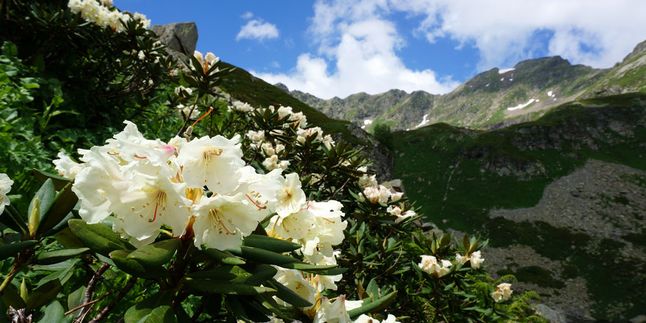 В июле здесь цветут рододендроны, розовые горцы, фиолетовые колокольчики, герань и нежно-голубые незабудки. В августе по маршруту появляются ягоды спелая черника и брусника.
