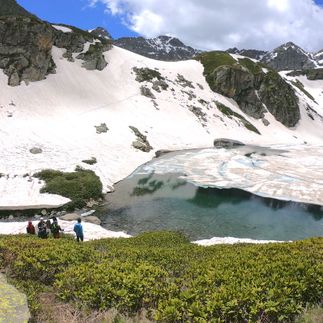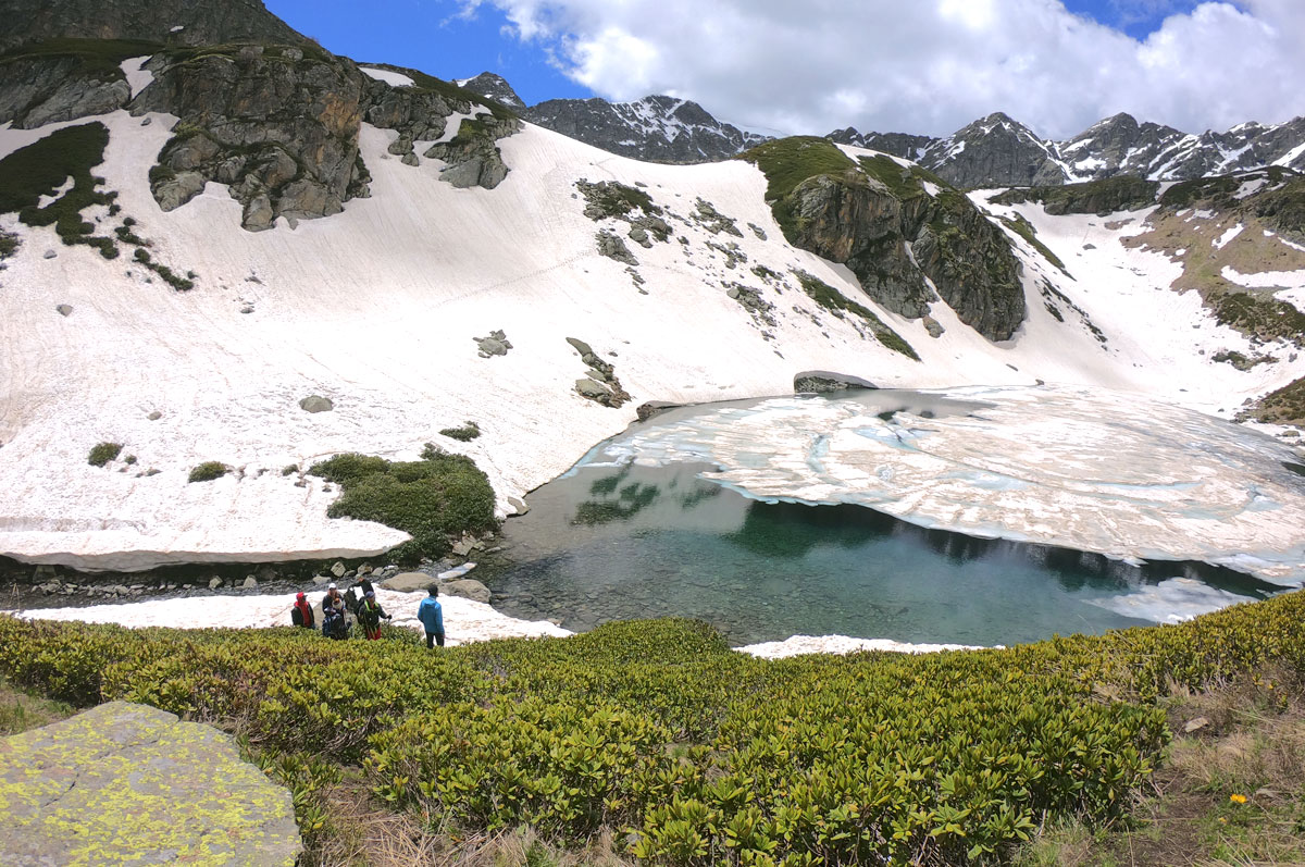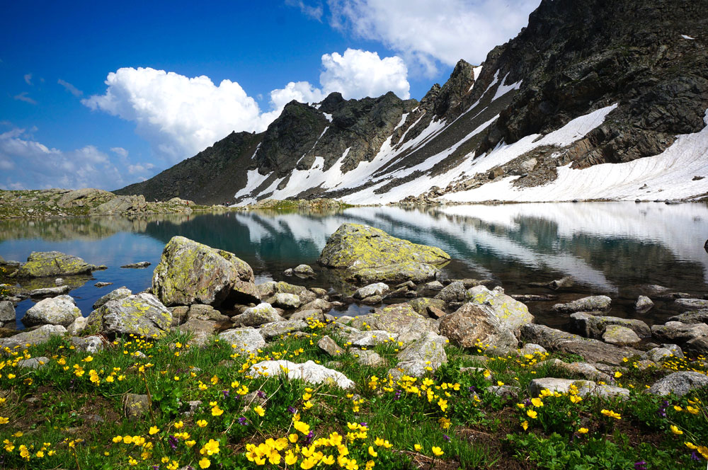 Поднявшись немного вверх по каменной морене, открывается еще один огромный скальный цирк с прекрасным, изумрудно-синим озером! Почти все лето на склонах цирка лежит снег, который искрится на солнышке и отражается белоснежными айсбергами в спокойной глади озера. В этом прекрасном месте сделаем привал и обед.