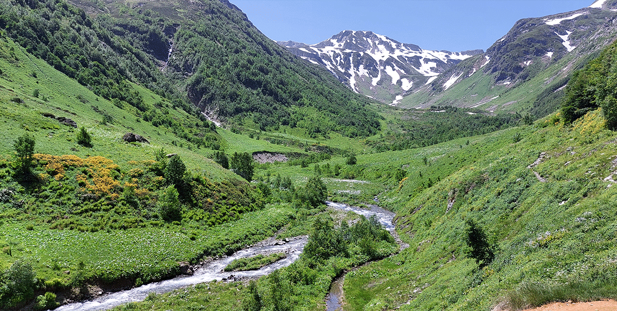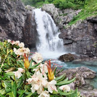 Тропа по ущелью дальше поведет нас вверх по долине, слева будут видны водопады. Вокруг в конце июня обычно цветут рододендроны. Еще ущелья Дамхурца в июне могут похвастаться розовыми горцами, фиолетовыми флоксами, геранью, лютиками. Чуть повыше в горах красуются целые поляны золотистого прострела.