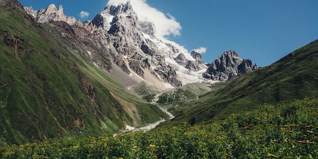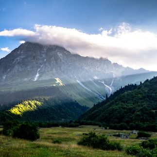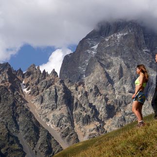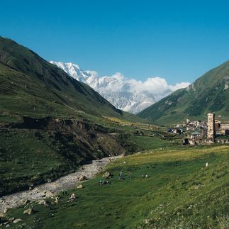 Садимся в трансфер и выдвигаемся до начала тропы к перевалу Загари (2700 м). Оттуда нам откроется потрясающий вид на заснеженную вершину Тетнульди (4860 м) и окружающие ее деревеньки, спрятанные в ущельях. После захватывающего дух зрелища спускаемся по альпийским лугам, где пасут овец, к общине Адиши.