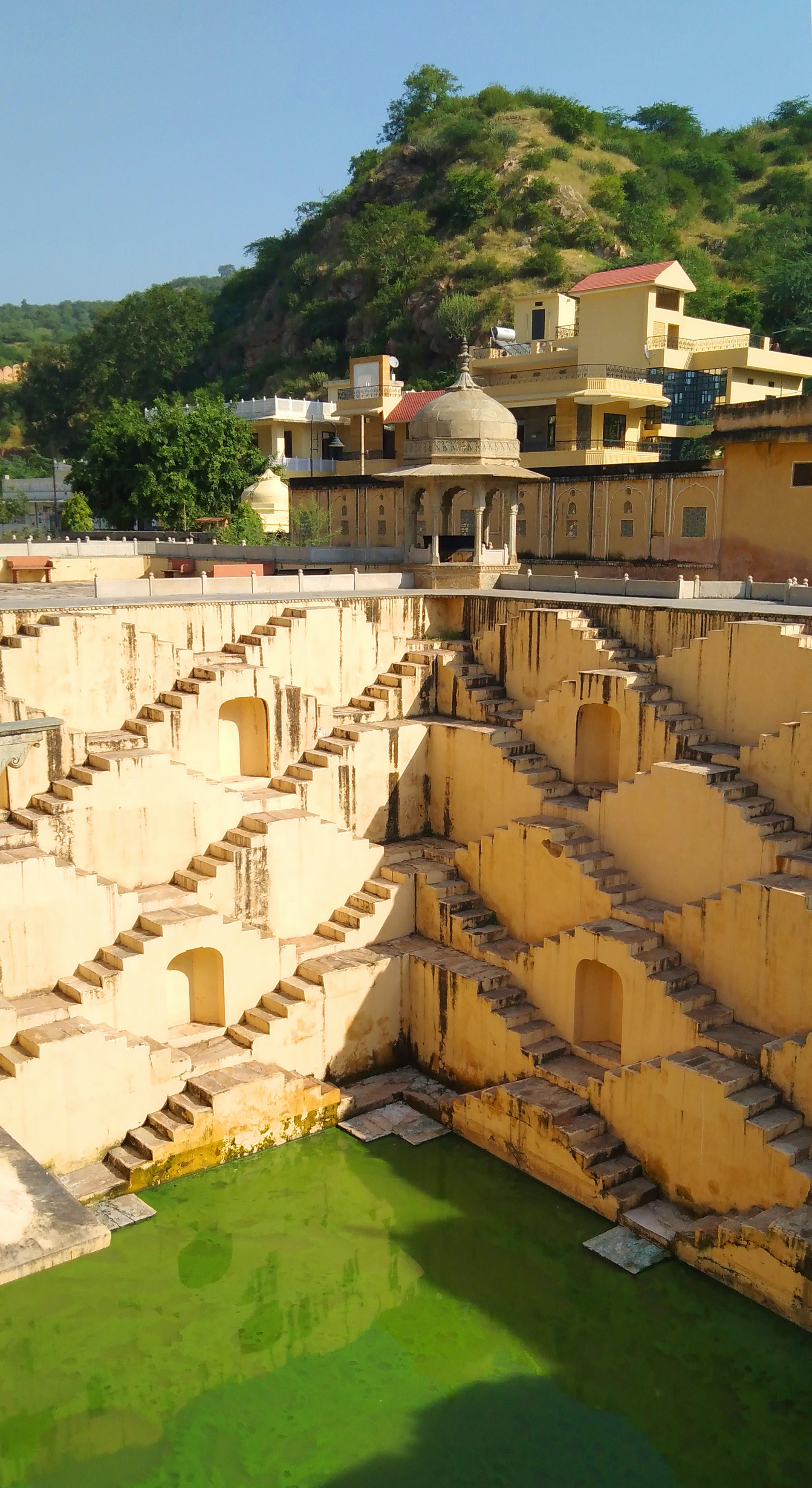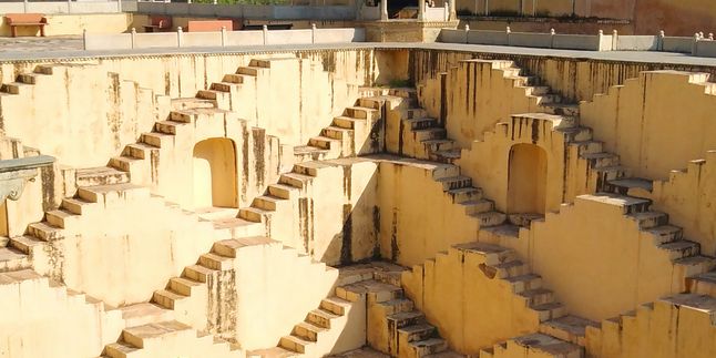Сначала мы побываем в городке Абанери и увидим необыкновенное архитектурное сооружение - древний ступенчатый колодец Чанд-Баори, огромный комплекс, похожий то ли на пирамиду вверх ногами, то ли на военный форт! Историки до сих пор спорят, когда он был построен. Одни говорят, что сооружение появилось между Ix и Xi веком, а другие предполагают, что построен колодец был значительно раньше- за 600 лет до нашей эры! Ну а местные жители вообще рассказывают туристам легенды о том, что колодец создали демоны всего за один день, тысячи лет назад)Одно можно сказать точно, в засушливом регионе Раджастан летом этот колодец был настоящим спасением и резервуаром питьевой воды. А в особо жаркие дни, люди собирались на его ступенях, чтобы отдохнуть в тени, ну и температура внизу градусов на 5-6 ниже, чем на поверхности. Глубина колодца, кстати, 30 метров, а ступеней в нем 3500!