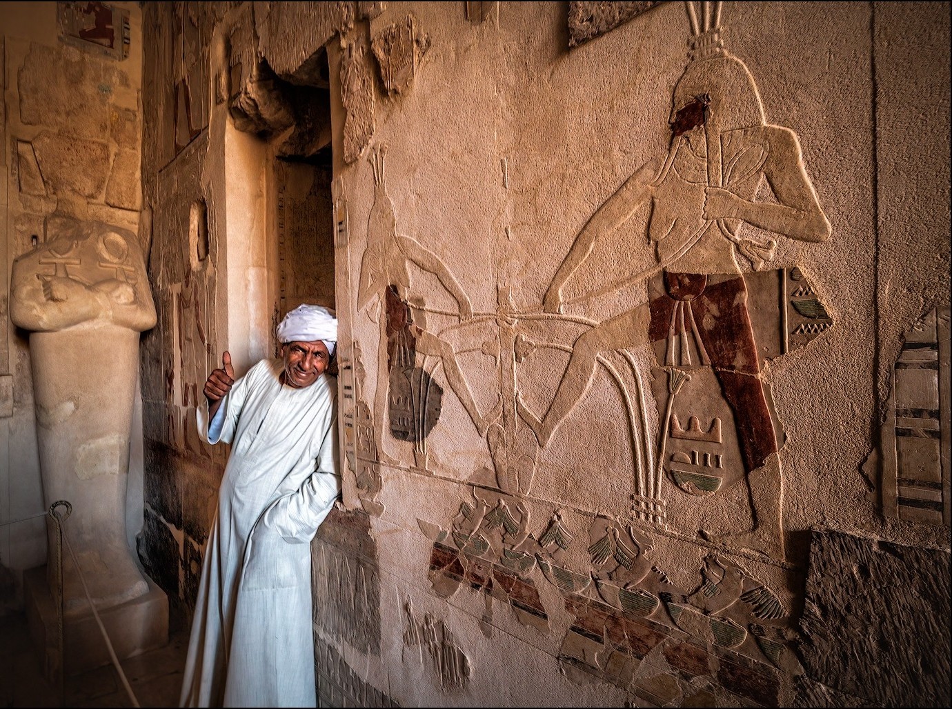 Перед нами раскинется знаменитая Долина Царей, погребальный храм Хатшепсут, расположенный в Дейр-эль-Бахри, а также поющие колоссы Мемнона — две огромные статуи высотой 18 метров и каждая весом более 700 тонн.