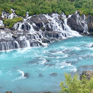 Утром выезжаем к водопадам Хрейнфоссар и Барнафосс — редкое место, где вода выходит прямо из лавовых полей. Очень графично и нестандартно для Исландии.